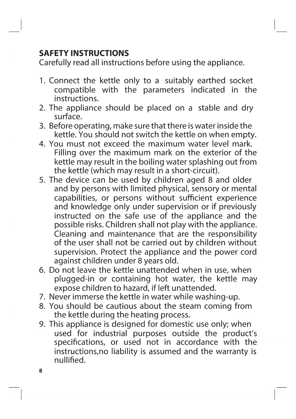 Allow the unit to cool down completely before cleaning. Do not immerse the kettle in water while washing up. The outside of the kettle may be wiped over with adamp cloth and washing-up liquid. Water stains inside the kettle can be removed by rubbing with acloth moisten with white vinegar; rinse the inside with water afterwards. Limescale should be removed in the following way: Fill the kettle with 0.6 litre of water and bring it to boil. Switch the kettle o and disconnect the kettle from the power supply. Pour 0.1 litre of white vinegar into the kettle. Allow to stand overnight. Discard the solution and rinse the inside with water. Fill the kettle with 1 litre of water and bring to boil. Discard the water and rinse the inside with water. If the scale is persistent, the cleaning should be done in the following way: - ll the kettle with 0.6 litre of white vinegar. Bring the vinegar to boil and leave the hot solution inside the kettle for about 30 minutes. Bring the vinegar to boil again. Discard the vinegar and rinse the inside with water. Fill the kettle with 1.0 litre of water and bring it to boil. Discard the water and rinse the inside with water. No timely removal of the scale from the heating element results in the heating element’s quicker wear. Any damage resulting from applying harsh descalling products available in the market are not covered by the producer’s warranty. If the power cord is damaged, it can be replaced only by an especially constructed one (with appropriate plugs and endings). FILTER The lter provided is made of mesh retaining scale deposits. The lter does not remove the scale, but it prevents any deposits from getting inside the kettle while the water is being poured in. The lter should be cleaned regularly. Hard water may block the lter after boiling water acouple of times. The lter can be removed and rinsed with water or cleaned with asoft brush. ENVIRONMENTAL PROTECTION - The appliance is made of materials which can be recycled. - It should be handed over to the applicable collection point for the recycling of electrical and electronic equipment.