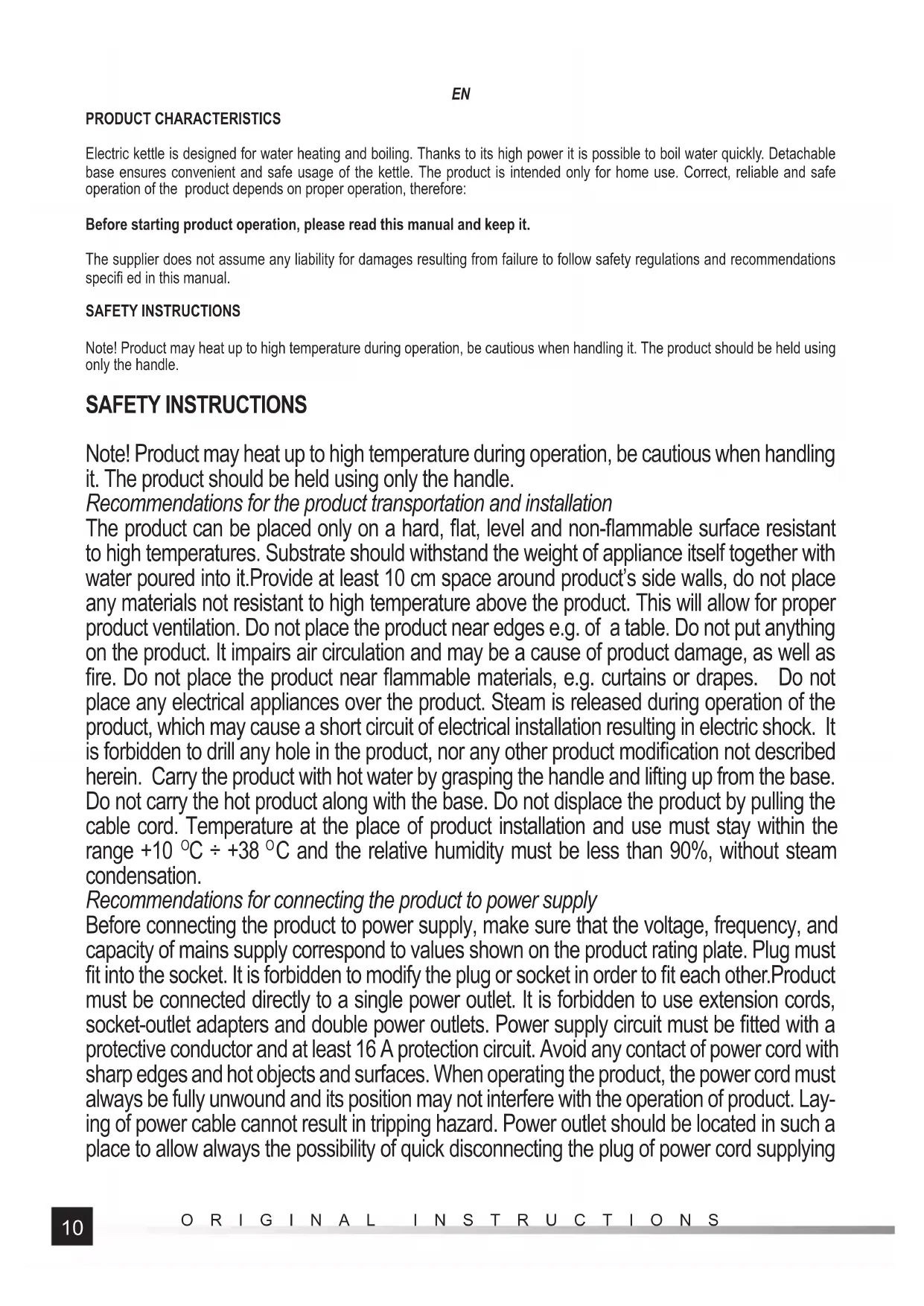 ORIGINAL INSTRUCTIONS PRODUCT CHARACTERISTICS Electric kettle is designed for water heating and boiling. Thanks to its high power it is possible to boil water quickly. Detachable base ensures convenient and safe usage of the kettle. The product is intended only for home use. Correct, reliable and safe operation of the product depends on proper operation, therefore: Before starting product operation, please read this manual and keep it. The supplier does not assume any liability for damages resulting from failure to follow safety regulations and recommendations specifi ed in this manual. SAFETY INSTRUCTIONS Note! Product may heat up to high temperature during operation, be cautious when handling it. The product should be held using only the handle. SAFETY INSTRUCTIONS Note! Product may heat up to high temperature during operation, be cautious when handling it. The product should be held using only the handle. Recommendations for the product transportation and installation The product can be placed only on a hard, fl at, level and non-fl ammable surface resistant to high temperatures. Substrate should withstand the weight of appliance itself together with water poured into it.Provide at least 10 cm space around product’s side walls, do not place any materials not resistant to high temperature above the product. This will allow for proper product ventilation. Do not place the product near edges e.g. of a table. Do not put anything on the product. It impairs air circulation and may be a cause of product damage, as well as fi re. Do not place the product near fl ammable materials, e.g. curtains or drapes. Do not place any electrical appliances over the product. Steam is released during operation of the product, which may cause a short circuit of electrical installation resulting in electric shock. It is forbidden to drill any hole in the product, nor any other product modifi cation not described herein. Carry the product with hot water by grasping the handle and lifting up from the base. Do not carry the hot product along with the base. Do not displace the product by pulling the cable cord. Temperature at the place of product installation and use must stay within the range +10