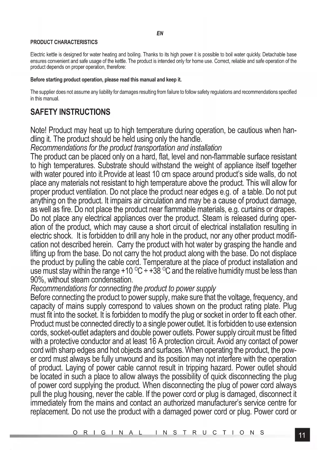 ORIGINAL INSTRUCTIONS PRODUCT CHARACTERISTICS Electric kettle is designed for water heating and boiling. Thanks to its high power it is possible to boil water quickly. Detachable base ensures convenient and safe usage of the kettle. The product is intended only for home use. Correct, reliable and safe operation of the product depends on proper operation, therefore: Before starting product operation, please read this manual and keep it. The supplier does not assume any liability for damages resulting from failure to follow safety regulations and recommendations specifi ed in this manual. SAFETY INSTRUCTIONS Note! Product may heat up to high temperature during operation, be cautious when han- dling it. The product should be held using only the handle. Recommendations for the product transportation and installation The product can be placed only on a hard, fl at, level and non-fl ammable surface resistant to high temperatures. Substrate should withstand the weight of appliance itself together with water poured into it.Provide at least 10 cm space around product’s side walls, do not place any materials not resistant to high temperature above the product. This will allow for proper product ventilation. Do not place the product near edges e.g. of a table. Do not put anything on the product. It impairs air circulation and may be a cause of product damage, as well as fi re. Do not place the product near fl ammable materials, e.g. curtains or drapes. Do not place any electrical appliances over the product. Steam is released during oper- ation of the product, which may cause a short circuit of electrical installation resulting in electric shock. It is forbidden to drill any hole in the product, nor any other product modifi - cation not described herein. Carry the product with hot water by grasping the handle and lifting up from the base. Do not carry the hot product along with the base. Do not displace the product by pulling the cable cord. Temperature at the place of product installation and use must stay within the range +10