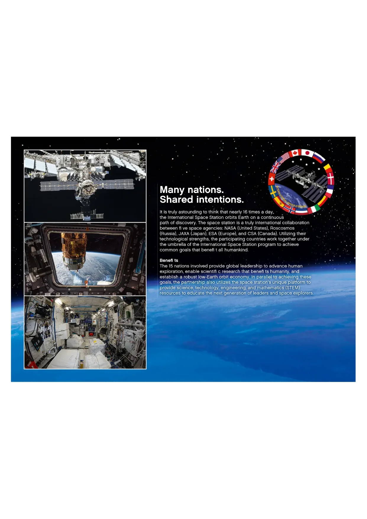 21321LEGO.com/brickseparator 23Many nations. Shared intentions. It is truly astounding to think that nearly 16 times a day, the International Space Station orbits Earth on a continuous path of discovery. The space station is a truly international collaboration between fi ve space agencies: NASA (United States), Roscosmos (Russia), JAXA (Japan), ESA (Europe), and CSA (Canada). Utilizing their technological strengths, the participating countries work together under the umbrella of the International Space Station program to achieve common goals that benefi t all humankind. Benefi ts The 15 nations involved provide global leadership to advance human exploration, enable scientifi c research that benefi ts humanity, and establish a robust low-Earth orbit economy. In parallel to achieving these goals, the partnership also utilizes the space station’s unique platform to provide science, technology, engineering, and mathematics (STEM) resources to educate the next generation of leaders and space explorers.Research in Space What happens onboard this space station is also astonishing. The station has maintained a continuous human presence in space since November 2000. The astronauts onboard have performed thousands of investigations dedicated to areas of earth and space science, biology, human physiology, physical sciences and technology demonstrations. As NASA states “The International Space Station is a state-of-the-art microgravity laboratory that is unlocking discoveries not possible on Earth and helping us push further into deep space.” Research on this immense orbiting laboratory, the largest spacecraft ever built, is investigating how we can send humans farther into space to the Moon and Mars to explore the frontiers of knowledge.Meet the Fan Designer Christoph Ruge “In 2014, I got the idea to model the International Space Station using the LEGO