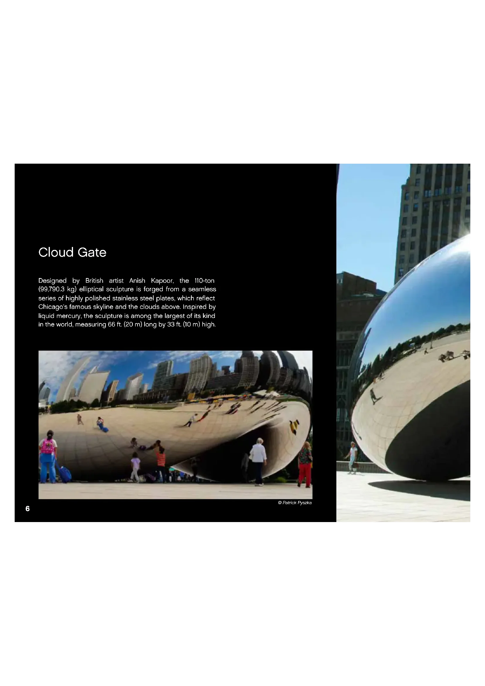 45Cloud Gate Designed by British artist Anish Kapoor, the 110-ton (99,790.3 kg) elliptical sculpture is forged from a seamless series of highly polished stainless steel plates, which reflect Chicago’s famous skyline and the clouds above. Inspired by liquid mercury, the sculpture is among the largest of its kind in the world, measuring 66 ft. (20 m) long by 33 ft. (10 m) high. © Patrick Pyszka 6© Walter Mitchell 7DuSable Bridge The DuSable Bridge is where the famous Michigan Avenue crosses the Chicago River and is both a beautiful work of art and a great civil engineering feat. Completed in 1920, the Beaux Arts style bridge was designed to resemble the Alexander III Bridge over the Seine in Paris. The double-deck bridge with highways on both levels opens up to allow boats to pass underneath. 8Standing on a triangular piece of land at the northwest corner of Michigan Avenue and the Chicago River, The Wrigley Building has been an iconic part of the city’s skyline for over 95 years. The Wrigley Building consists of two towers, completed in 1921 and 1924, connected by walkways at the 3rd and 14th floors. The Wrigley Building’s architecture combines French Renaissance and Spanish Revival styles, but adds a unique American twist. The Wrigley Building is clad in more than 250,000 terra cotta tiles of more than 500 unique designs. The tiles are six different colors, ranging from blue-white at the bottom to creamy white at the top, to enhance a sunlit appearance. The Wrigley Building