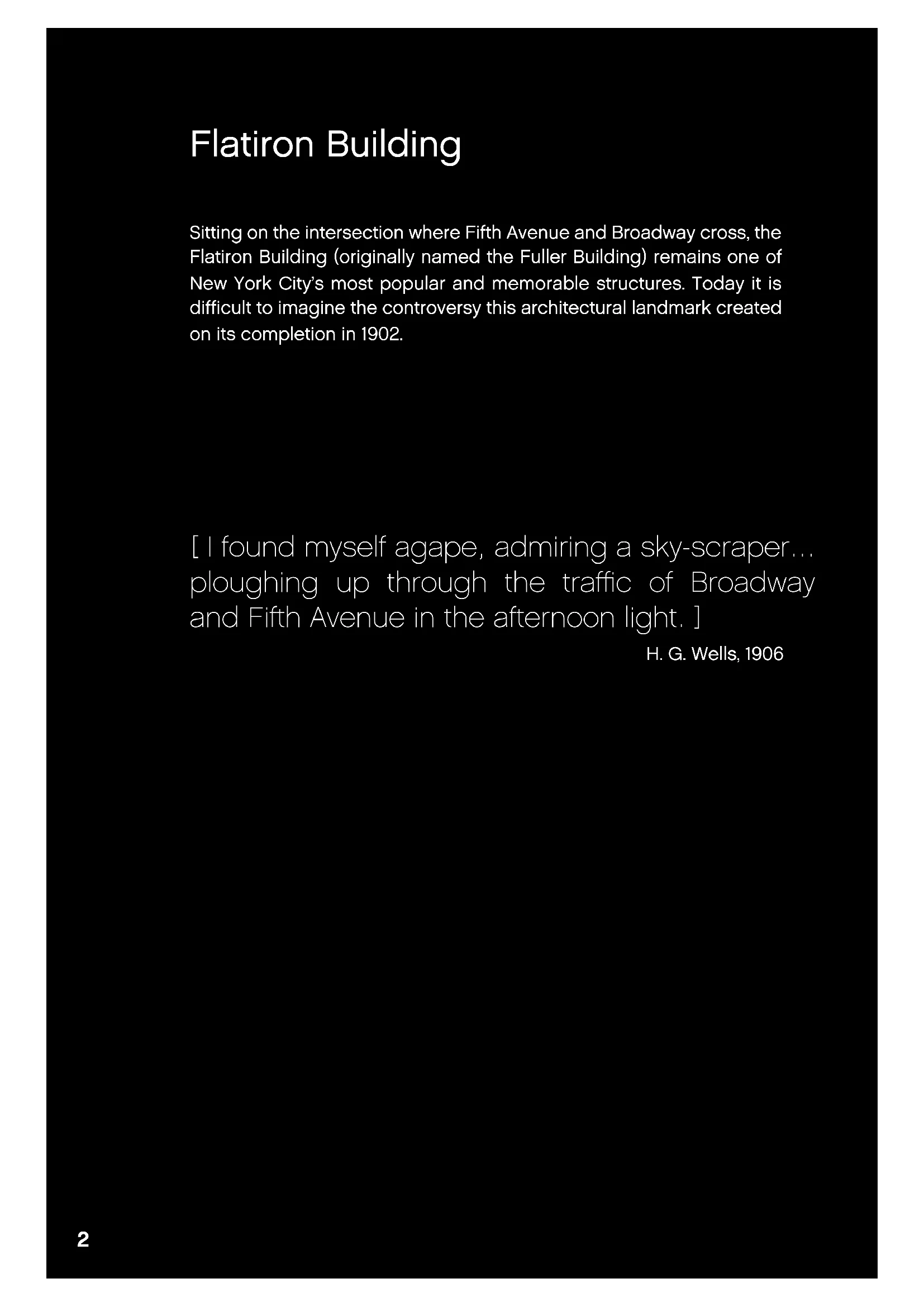 © Per Tropp-Christiansen9 The Building Today Although never the tallest building in New York, or even the first building in the country with a triangular ground plan, the Flatiron Building remains an iconic symbol of the city of New York. Its enduring popularity with tourists, artists, and photographers also makes it one of the most photographed buildings in the world. The famous building has appeared in countless movies, TV series, and comics. It was home to Peter Parker’s Daily Bugle in the Spiderman movies, and was even accidently destroyed by the U.S. Army in the 1998 film Godzilla. The building was designated a New York City Landmark in 1966, added to the National Register of Historic Places in 1979, and became a National Historic Landmark in 1989. Valued today at $190 million, the Flatiron Building continues to function as a popular retail and office space, and is home to a large number of U.S. and international companies. In 2009, Sorgente Group of America acquired the majority stake of the Flatiron Building. Sorgente Group of America is the American Holding of Sorgente Group, an Italian real estate investment company. [ ... appeared to be moving toward me like the bow of a monster ocean steamer—a picture of a new America still in the making. ] PhotographerAlfredStieglitz10 Facts about Flatiron Building Location: ........................................ New York City, USA Architect: ...................................... D. H. Burnham & Co: Daniel H. Burnham Style: .............................................. Renaissance Revival with Beaux-Arts styling Materials: .................................... Steel frame structure, façade of limestone and terra-cotta Height: .......................................... 1902: 285 ft. (86.9 m). Today: 307 ft. (93 m). Weight: ......................................... 3,680 tons (3,338.5 metric tons) Opened: ...................................... 190211 © Shutterstock12 Le Flatiron Building Situé à l'intersection de la Cinquième avenue et de Broadway, le Flatiron Building (appelé à l'origine Fuller Building) reste l'une des structures les plus populaires et les plus mémorables de New York. Il est aujourd'hui difficile d'imaginer la controverse que ce monument architectural suscita lorsque sa construction prit fin en 1902. [ Je me trouvais stupéfait, à admirer un gratte-ciel... en avançant dans la circulation de Broadway et de la Cinquième avenue dans la lumière de l'après-midi. ] H. G. Wells, 190613 © Per Tropp-Christiansen14 Histoire Alors que la ville de New York s'étendait vers le nord pendant la deuxième moitié du 19