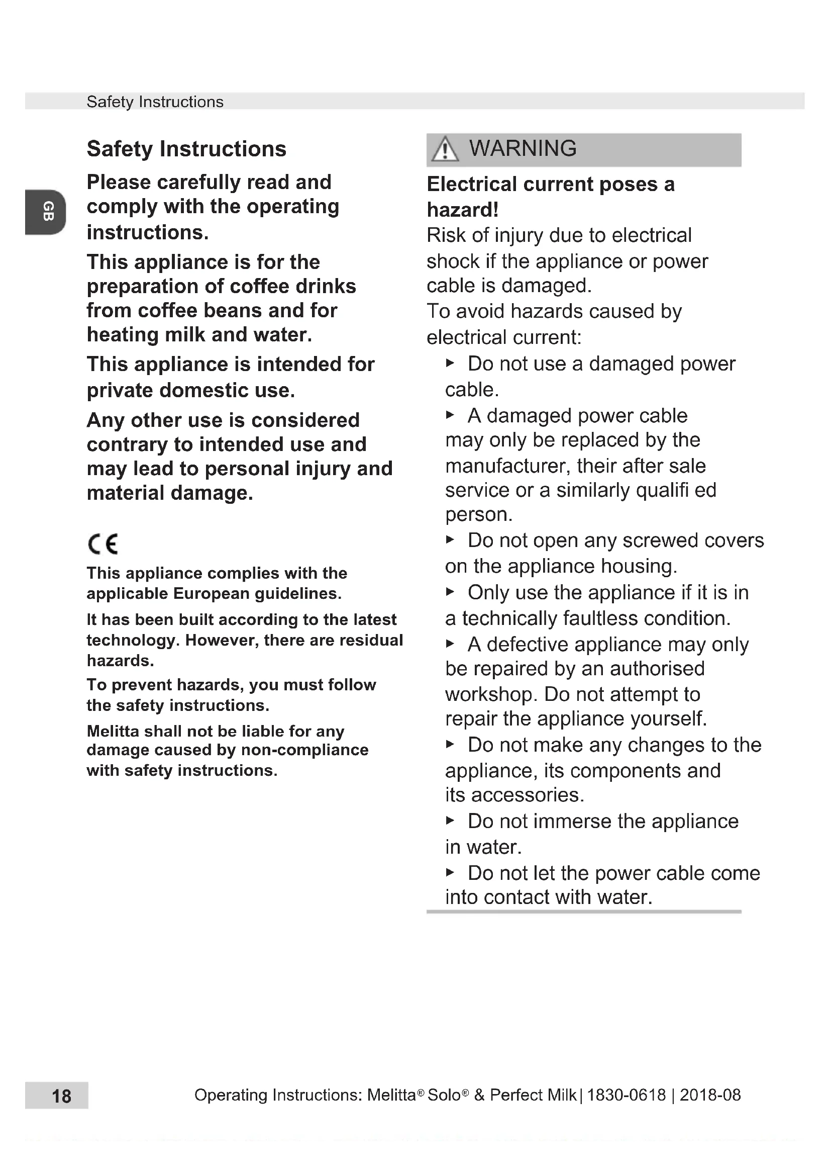 Safety Instructions Please carefully read and comply with the operating instructions. This appliance is for the preparation of coffee drinks from coffee beans and for heating milk and water. This appliance is intended for private domestic use. Any other use is considered contrary to intended use and may lead to personal injury and material damage. This appliance complies with the applicable European guidelines. It has been built according to the latest technology. However, there are residual hazards. To prevent hazards, you must follow the safety instructions. Melitta shall not be liable for any damage caused by non-compliance with safety instructions. WARNING Electrical current poses a hazard! Risk of injury due to electrical shock if the appliance or power cable is damaged. To avoid hazards caused by electrical current: ▶ Do not use a damaged power cable. ▶ A damaged power cable may only be replaced by the manufacturer, their after sale service or a similarly qualifi ed person. ▶ Do not open any screwed covers on the appliance housing. ▶ Only use the appliance if it is in a technically faultless condition. ▶ A defective appliance may only be repaired by an authorised workshop. Do not attempt to repair the appliance yourself. ▶ Do not make any changes to the appliance, its components and its accessories. ▶ Do not immerse the appliance in water. ▶ Do not let the power cable come into contact with water.Operating Instructions: Melitta