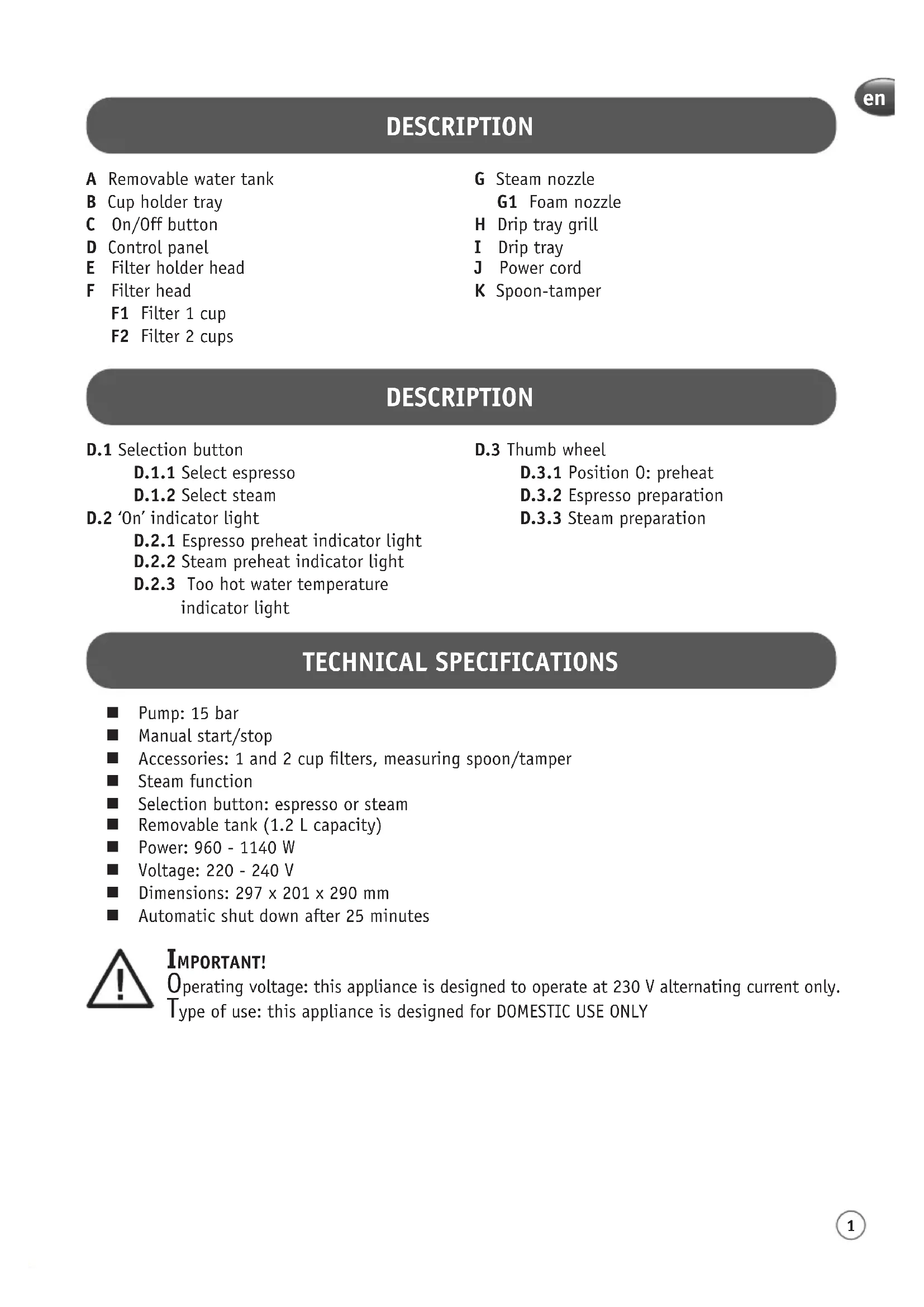 TECHNICAL SPECIFICATIONS Pump: 15 bar Manual start/stop Accessories: 1 and 2 cup filters, measuring spoon/tamper Steam function Selection button: espresso or steam Removable tank (1.2 L capacity) Power: 960 - 1140 W Voltage: 220 - 240 V Dimensions: 297 x 201 x 290 mm Automatic shut down after 25 minutes IMPORTANT! Operating voltage: this appliance is designed to operate at 230 V alternating current only. Type of use: this appliance is designed for DOMESTIC USE ONLY DESCRIPTION A Removable water tank B Cup holder tray C On/Off button D Control panel E Filter holder head F Filter head F1 Filter 1 cup F2 Filter 2 cups G Steam nozzle G1 Foam nozzle H Drip tray grill I Drip tray J Power cord K Spoon-tamper DESCRIPTION D.1 Selection button D.1.1 Select espresso D.1.2 Select steam D.2 ‘On’ indicator light D.2.1 Espresso preheat indicator light D.2.2 Steam preheat indicator light D.2.3 Too hot water temperature indicator light D.3 Thumb wheel D.3.1 Position O: preheat D.3.2 Espresso preparation D.3.3 Steam preparation32