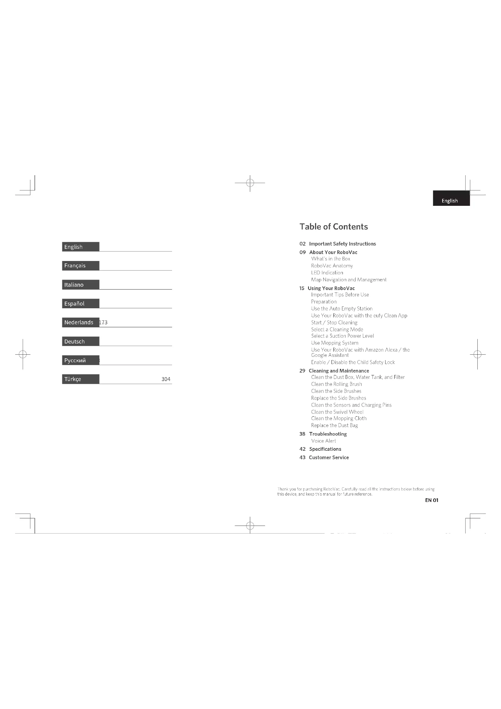 RoboVac L35 Hybrid+ Owner’s Manual T2182 51005003863 V01English EN 01 Thank you for purchasing RoboVac. Carefully read all the instructions below before using this device, and keep this manual for future reference. Table of Contents 02 Important Safety Instructions 09 About Your RoboVac What's in the Box RoboVac Anatomy LED Indication Map Navigation and Management 15 Using Your RoboVac Important Tips Before Use Preparation Use the Auto Empty Station Use Your RoboVac with the eufy Clean App Start / Stop Cleaning Select a Cleaning Mode Select a Suction Power Level Use Mopping System Use Your RoboVac with Amazon Alexa / the Google Assistant Enable / Disable the Child Safety Lock 29 Cleaning and Maintenance Clean the Dust Box, Water Tank, and Filter Clean the Rolling Brush Clean the Side Brushes Replace the Side Brushes Clean the Sensors and Charging Pins Clean the Swivel Wheel Clean the Mopping Cloth Replace the Dust Bag 38 Troubleshooting Voice Alert 42 Specifications 43 Customer Service English 01 Français 44 Italiano 88 Español 131 Nederlands 173 Deutsch 216 Pусский 258 Türkçe 304English English 02 EN EN 03 Important Safety Instructions To reduce the risk of injury or damage, keep these instructions at hand when setting up, using, and maintaining this device.