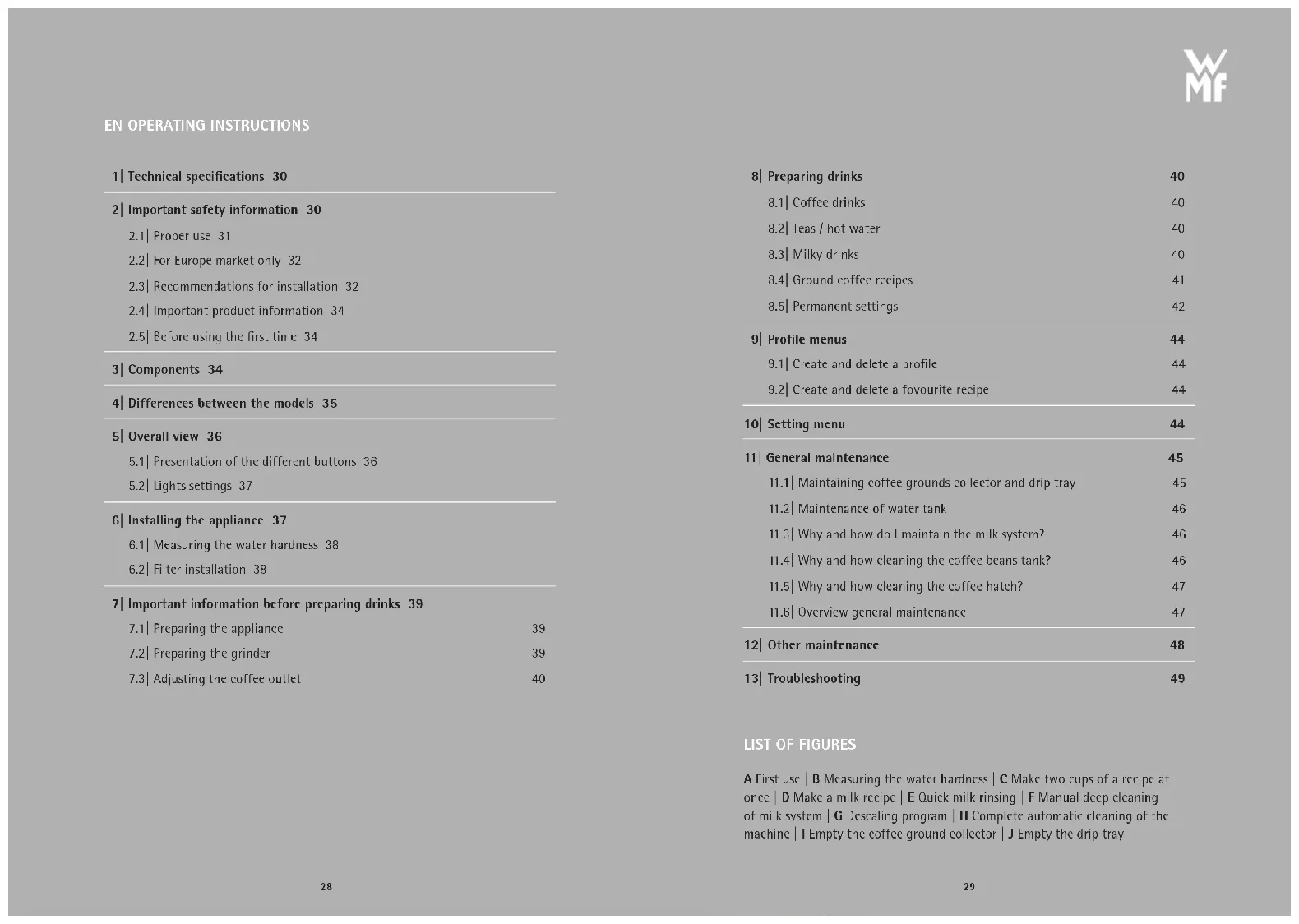 8|Preparing drinks 40 8.1|Coffee drinks 40 8.2|Teas / hot water 40 8.3|Milky drinks 40 8.4|Ground coffee recipes 41 8.5|Permanent settings 42 9|Profile menus 44 9.1|Create and delete a profile 44 9.2|Create and delete a fovourite recipe 44 10|Setting menu 44 11|General maintenance 45 11.1|Maintaining coffee grounds collector and drip tray 45 11.2|Maintenance of water tank 46 11.3|Why and how do I maintain the milk system? 46 11.4|Why and how cleaning the coffee beans tank? 46 11.5|Why and how cleaning the coffee hatch? 47 11.6|Overview general maintenance 47 12|Other maintenance 48 13|Troubleshooting 49
