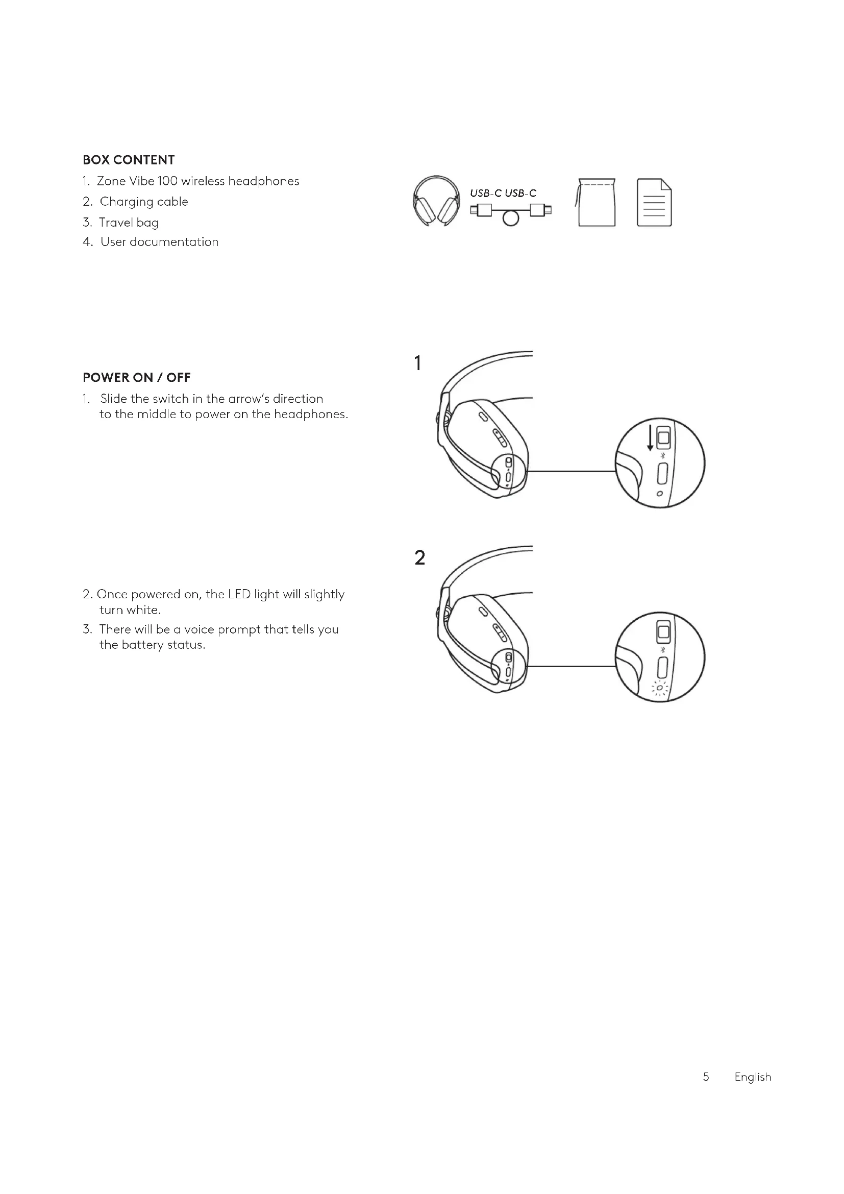 pairing Power button 2 sec. press L L L Voice notications indicate when the microphone is on / o mute. Mute "Mute on" "Mute o" MUTE There are 2 ways to mute your microphone. Press the button to mute. Flip up or down the mic boom to mute or unmute. 7EnglishHEADPHONES LIGHT INDICATOR Note: - User-triggered behaviors, such as Bluetooth