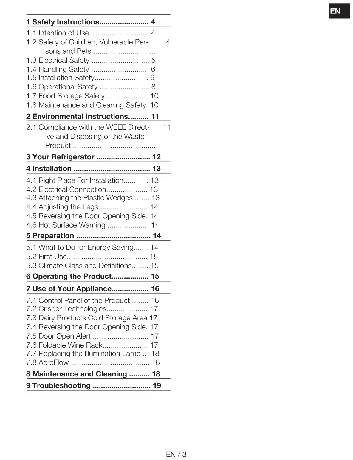 It is an air distribution system that provides homogeneous temperature distribution. With the air circulation, the homogeneous temper- ature distribution is ensured in the fresh food storage compartment, and the temperature fluctuations are kept at low levels. No direct air blowing over the food is realized and this helps to reduce moisture loss. It preserves the freshness of the food stored in the fresh food compartment of the refrigerator. In this way, your food is stored at more stable tem- peratures and the contact with air is re- duced. The drying and shrinking of foods by losing moisture is prevented and freshness is provided for a longer time. 8 Maintenance and Cleaning