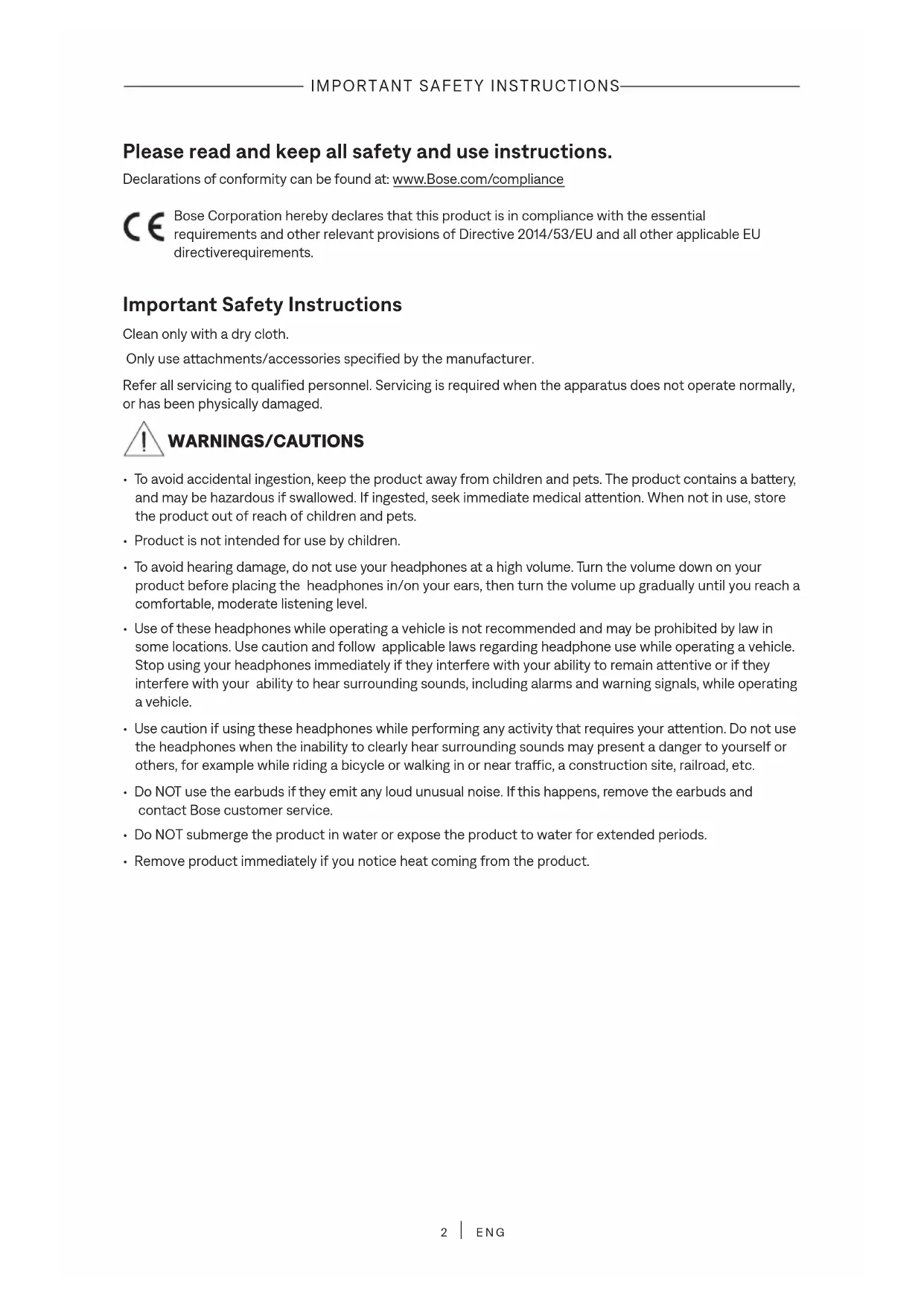 ENG Please read and keep all safety and use instructions. Declarations of conformity can be found at: www.Bose.com/compliancewww.Bose.com/compliance Bose Corporation hereby declares that this product is in compliance with the essential requirements and other relevant provisions of Directive 2014/53/EU and all other applicable EU directive requirements. Important Safety Instructions Clean only with a dry cloth. Only use aachments/accessories specified by the manufacturer. Refer all servicing to qualified personnel. Servicing is required when the apparatus does not operate normally, or has been physically damaged. WARNINGS/CAUTIONS