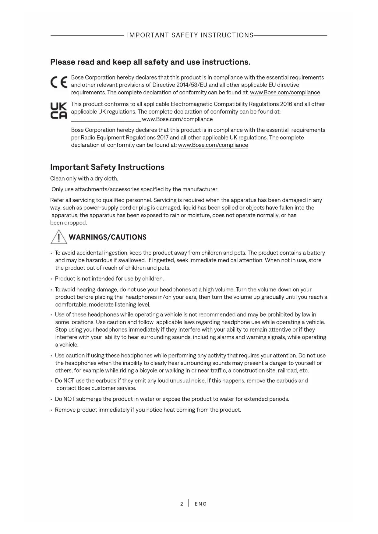 ENG Please read and keep all safety and use instructions. Bose Corporation hereby declares that this product is in compliance with the essential requirements and other relevant provisions of Directive 2014/53/EU and all other applicable EU directive requirements. The complete declaration of conformity can be found at: www.Bose.com/compliancewww.Bose.com/compliance This product conforms to all applicable Electromagnetic Compatibility Regulations 2016 and all other applicable UK regulations. The complete declaration of conformity can be found at: www.Bose.com/compliancewww.Bose.com/compliance Bose Corporation hereby declares that this product is in compliance with the essential requirements per Radio Equipment Regulations 2017 and all other applicable UK regulations. The complete declaration of conformity can be found at: www.Bose.com/compliancewww.Bose.com/compliance Important Safety Instructions Clean only with a dry cloth. Only use aachments/accessories specified by the manufacturer. Refer all servicing to qualified personnel. Servicing is required when the apparatus has been damaged in any way, such as power-supply cord or plug is damaged, liquid has been spilled or objects have fallen into the apparatus, the apparatus has been exposed to rain or moisture, does not operate normally, or has been dropped. WARNINGS/CAUTIONS