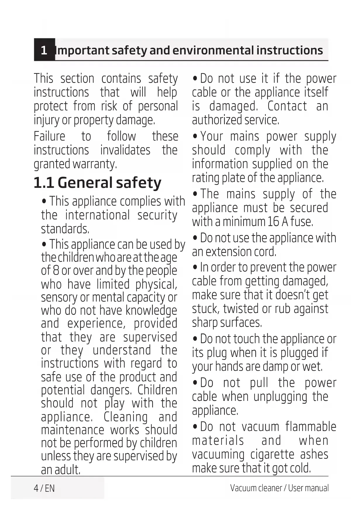 - Do not vacuum flammable materals and when vacuumng cgarette ashes make sure that t got cold. 1 Important safety and environmental instructionsVacuum cleaner / User manual 5 / EN