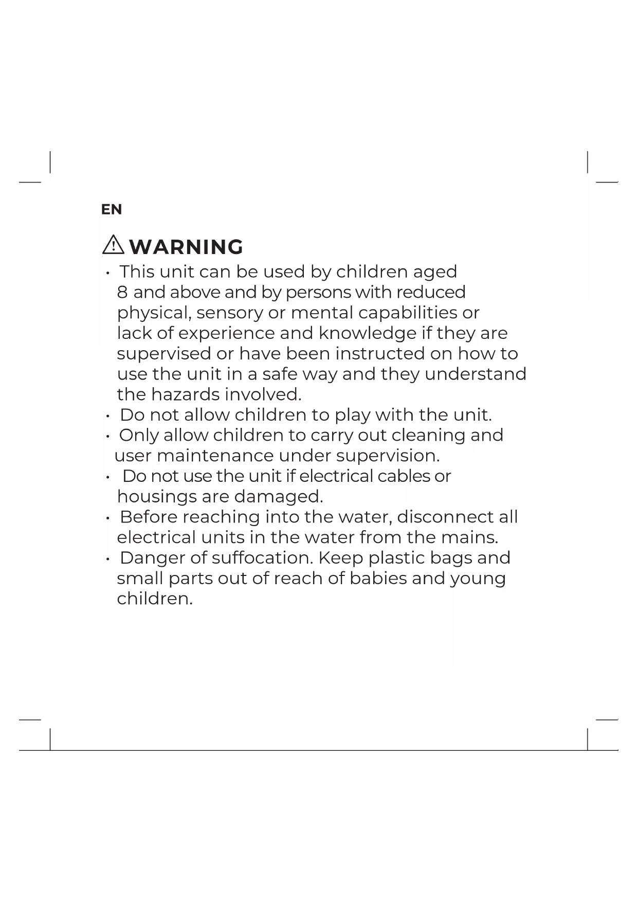 - Before reaching into the water, disconnect all electrical units in the water from the mains.