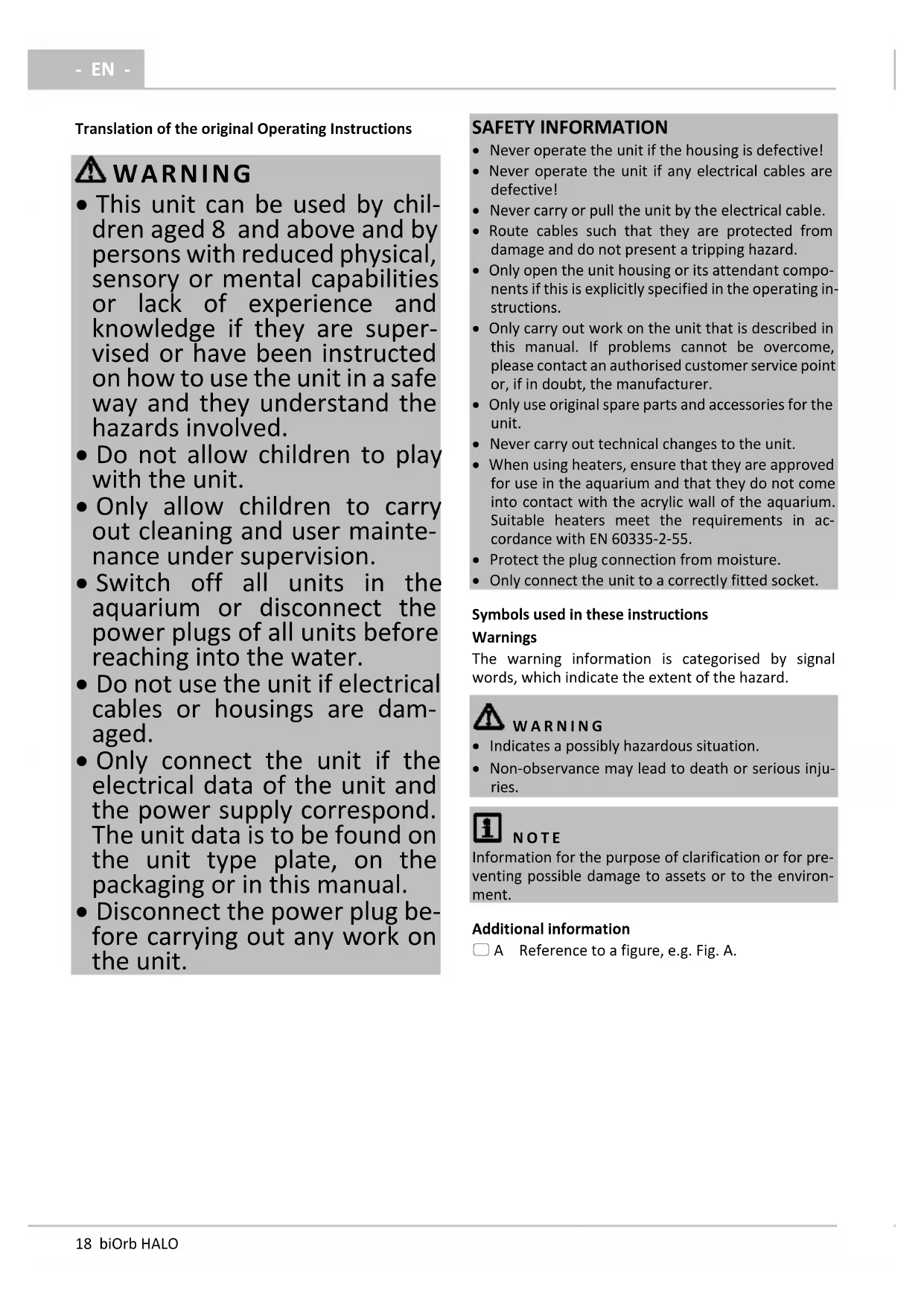 - Ensure that the water temperature is suitable for the type of fish. The supplied components may only be used for the bi- Orb products as specified in the following: