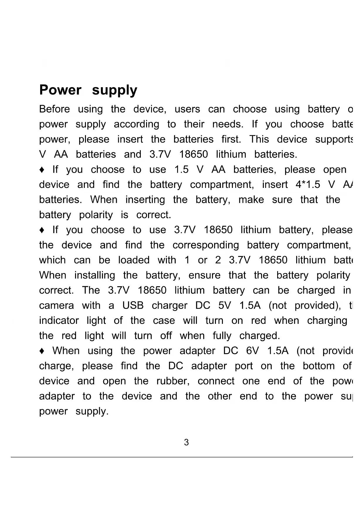 Power supply Before using the device, users can choose using battery or DC power supply according to their needs. If you choose battery power, please insert the batteries first. This device supports 1.5 V AA batteries and 3.7V 18650 lithium batteries. ♦ If you choose to use 1.5 V AA batteries, please open the device and find the battery compartment, insert 4*1.5 V AA batteries. When inserting the battery, make sure that the battery polarity is correct. ♦ If you choose to use 3.7V 18650 lithium battery, please open the device and find the corresponding battery compartment, which can be loaded with 1 or 2 3.7V 18650 lithium battery. When installing the battery, ensure that the battery polarity is correct. The 3.7V 18650 lithium battery can be charged in the camera with a USB charger DC 5V 1.5A (not provided), the indicator light of the case will turn on red when charging and the red light will turn off when fully charged. ♦ When using the power adapter DC 6V 1.5A (not provided) to charge, please find the DC adapter port on the bottom of the device and open the rubber, connect one end of the power adapter to the device and the other end to the power supply for power supply.4 Inserting the memory card Please prepare a micro SD card and insert it into the camera for saving files. Before recording, please format the memory card first. ♦ Supports micro SD card up to 512GB. Using class 6 or higher speed card is recommended. ♦ To avoid malfunction, the memory card should be far away from water, strong vibration, dust, hot source and direct sunlight. ♦ Do not insert the memory card forcibly. Please refer to the marking on the camera. ♦ For the first time use, please wait for the memory card temperature reach the ambient temperature. The camera will be short-circuit influenced by environment temperature and humidity. Please notice protection for the camera when using it outdoor. ♦ If the capacity of memory card is full, the camera will stop recording automatically if endless capture function is turned off. ♦ Press the edge of the card gently to pop-out the micro SD card.5 Basic operation Turn the camera on and off Switch the Mode switch to “Test/On” to turn on the camera. After power on, it will pop up the battery type selection interface: 1.5V alkaline battery/3.7V lithium battery, press the up and down keys to select the corresponding battery, press the OK button to confirm. Switch the Mode switch to “Off” to turn off the camera. System setup Switch Mode switch to “Test”, then you can set the system parameters.