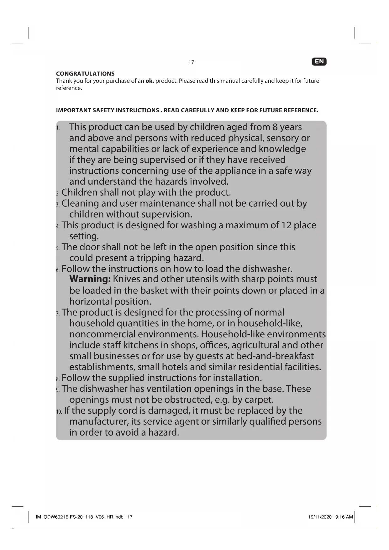 - Do not overload your dishwasher as this will impair the results. IM_ODW6021E FS-201118_V06_HR.indb 23IM_ODW6021E FS-201118_V06_HR.indb 23 19/11/2020 9:16 AM19/11/2020 9:16 AM24 Size = A5