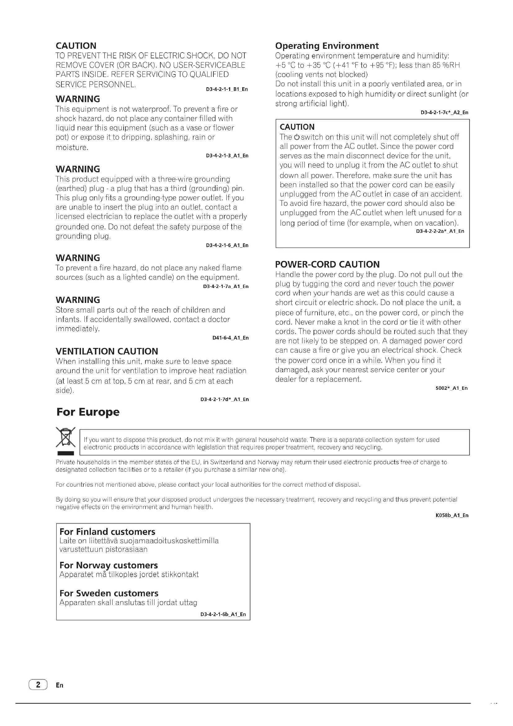 SERVICE PERSONNEL. D3-4-2-1-1_B1_En WARNING This equipment is not waterproof. To prevent a fire or shock hazard, do not place any container filled with liquid near this equipment (such as a vase or flower pot) or expose it to dripping, splashing, rain or moisture. D3-4-2-1-3_A1_En WARNING This product equipped with a three-wire grounding (earthed) plug - a plug that has a third (grounding) pin. This plug only fits a grounding-type power outlet. If you are unable to insert the plug into an outlet, contact a licensed electrician to replace the outlet with a properly grounded one. Do not defeat the safety purpose of the grounding plug. D3-4-2-1-6_A1_EnD3-4-2-1-6b_A1_En Laite on liitettävä suojamaadoituskoskettimilla varustettuun pistorasiaan For Finland customers For Norway customers For Sweden customers Apparatet må tilkoples jordet stikkontakt Apparaten skall anslutas till jordat uttag WARNING To prevent a fire hazard, do not place any naked flame sources (such as a lighted candle) on the equipment. D3-4-2-1-7a_A1_En Operating Environment Operating environment temperature and humidity: +5 °C to +35 °C (+41 °F to +95 °F); less than 85 %RH (cooling vents not blocked) Do not install this unit in a poorly ventilated area, or in locations exposed to high humidity or direct sunlight (or strong artificial light). D3-4-2-1-7c*_A2_En VENTILATION CAUTION When installing this unit, make sure to leave space around the unit for ventilation to improve heat radiation (at least 5 cm at top, 5 cm at rear, and 5 cm at each side). D3-4-2-1-7d*_A1_En CAUTION The switch on this unit will not completely shut off all power from the AC outlet. Since the power cord serves as the main disconnect device for the unit, you will need to unplug it from the AC outlet to shut down all power. Therefore, make sure the unit has been installed so that the power cord can be easily unplugged from the AC outlet in case of an accident. To avoid fire hazard, the power cord should also be unplugged from the AC outlet when left unused for a long period of time (for example, when on vacation). D3-4-2-2-2a*_A1_En WARNING Store small parts out of the reach of children and infants. If accidentally swallowed, contact a doctor immediately. D41-6-4_A1_En If you want to dispose this product, do not mix it with general household waste. There is a separate collection system for used electronic products in accordance with legislation that requires proper treatment, recovery and recycling. Private households in the member states of the EU, in Switzerland and Norway may return their used electronic products free of charge to designated collection facilities or to a retailer (if you purchase a similar new one). For countries not mentioned above, please contact your local authorities for the correct method of disposal. By doing so you will ensure that your disposed product undergoes the necessary treatment, recovery and recycling and thus prevent potential negative effects on the environment and human health. K058b_A1_En POWER-CORD CAUTION Handle the power cord by the plug. Do not pull out the plug by tugging the cord and never touch the power cord when your hands are wet as this could cause a short circuit or electric shock. Do not place the unit, a piece of furniture, etc., on the power cord, or pinch the cord. Never make a knot in the cord or tie it with other cords. The power cords should be routed such that they are not likely to be stepped on. A damaged power cord can cause a fire or give you an electrical shock. Check the power cord once in a while. When you find it damaged, ask your nearest service center or your dealer for a replacement. S002*_A1_EnEn