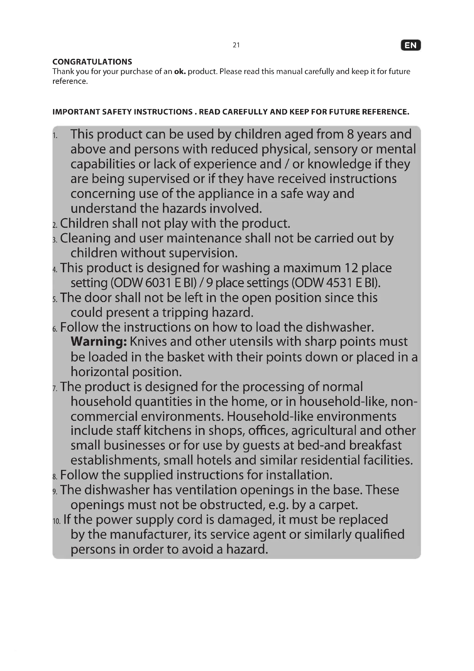Download the instructions for your Dishwasher in PDF format for free! Find your manual ODW 4531 BI - OK and take your electronic device back in hand. On this page are published all the documents necessary for the use of your device. ODW 4531 BI by OK.