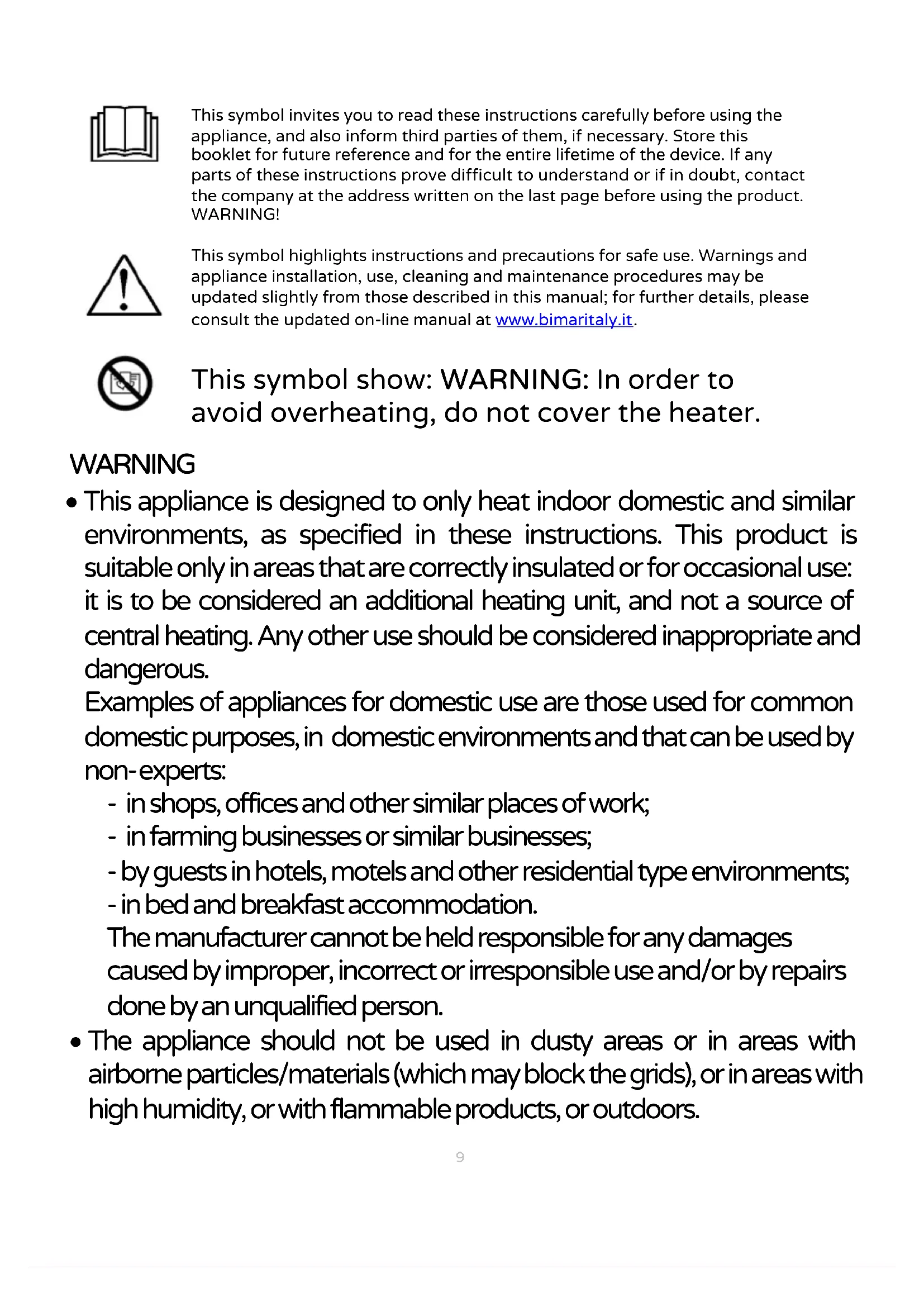 This symbol invites you to read these instructions carefully before using the appliance, and also inform third parties of them, if necessary. Store this booklet for future reference and for the entire lifetime of the device. If any parts of these instructions prove difficult to understand or if in doubt, contact the company at the address written on the last page before using the product. WARNING! This symbol highlights instructions and precautions for safe use. Warnings and appliance installation, use, cleaning and maintenance procedures may be updated slightly from those described in this manual; for further details, please consult the updated on-line manual at www.bimaritaly.it