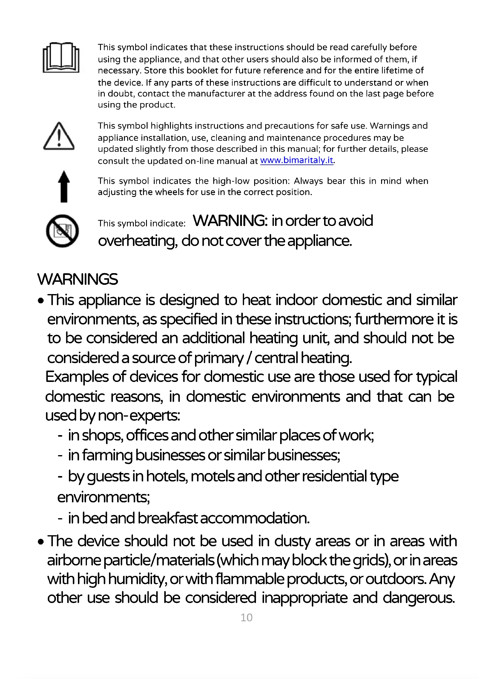 This symbol highlights instructions and precautions for safe use. Warnings and appliance installation, use, cleaning and maintenance procedures may be updated slightly from those described in this manual; for further details, please consult the updated on-line manual at www.bimaritaly.it. This symbol indicates the high-low position: Always bear this in mind when adjusting the wheels for use in the correct position.