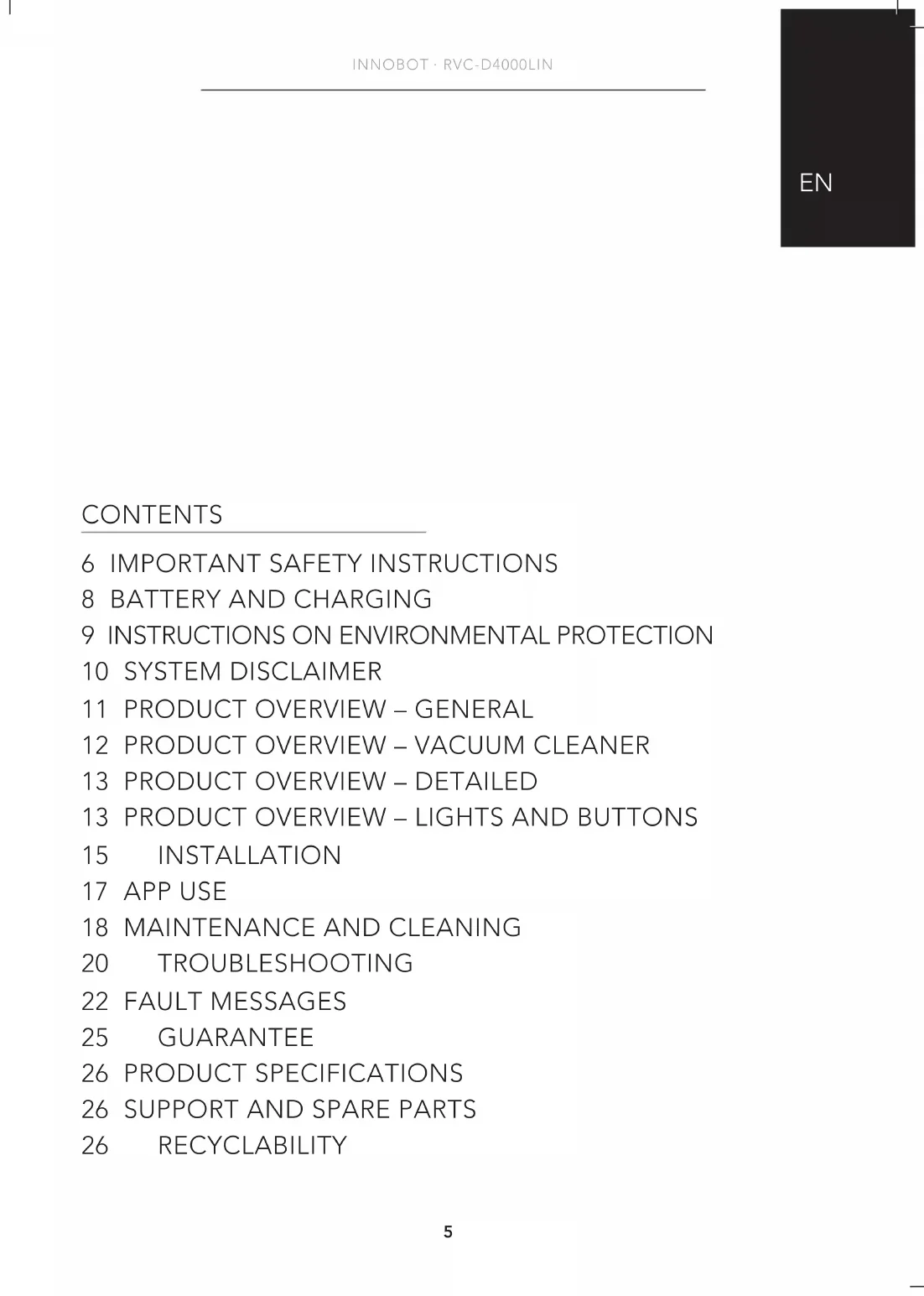 Download the instructions for your Robot vacuum in PDF format for free! Find your manual Innobot RVC-D4000LIN - WILFA and take your electronic device back in hand. On this page are published all the documents necessary for the use of your device. Innobot RVC-D4000LIN by WILFA.