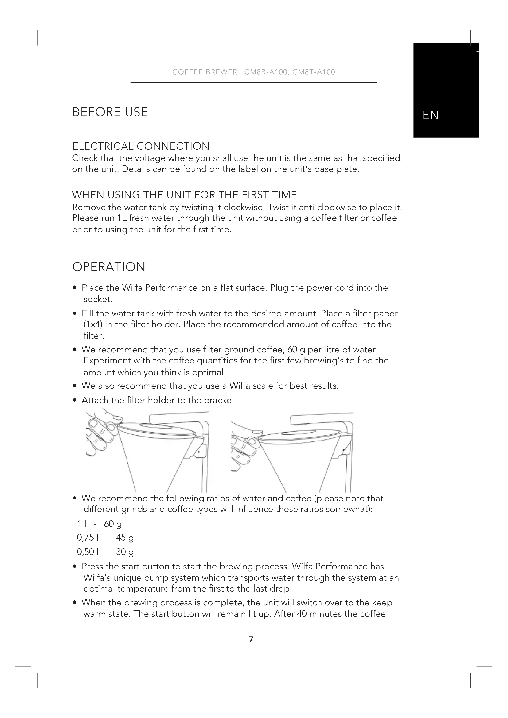 BEFORE USE ELECTRICAL CONNECTION Check that the voltage where you shall use the unit is the same as that specied on the unit. Details can be found on the label on the unit’s base plate. WHEN USING THE UNIT FOR THE FIRST TIME Remove the water tank by twisting it clockwise. Twist it anti-clockwise to place it. Please run 1L fresh water through the unit without using a coffee lter or coffee prior to using the unit for the rst time. OPERATION