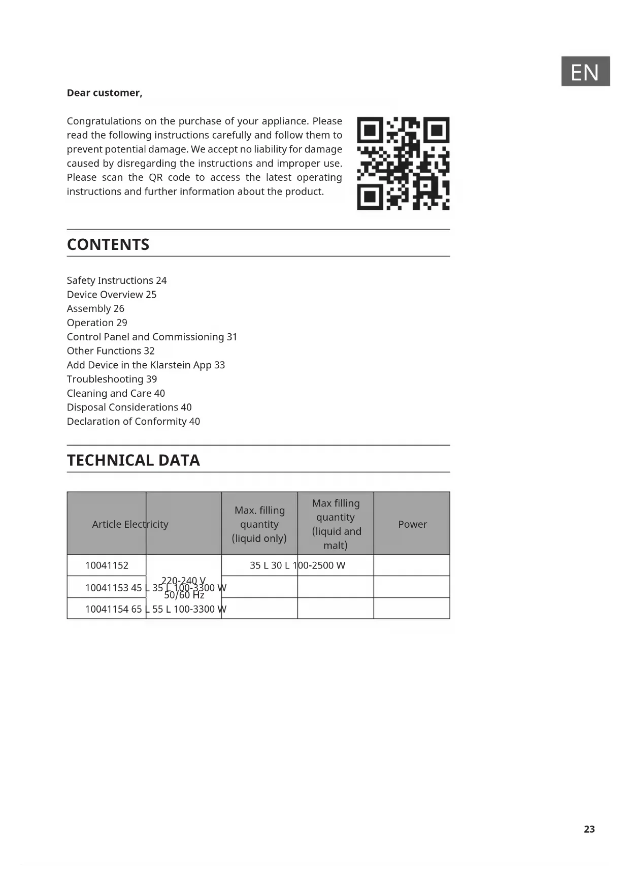 Dear customer, Congratulations on the purchase of your appliance. Please read the following instructions carefully and follow them to prevent potential damage. We accept no liability for damage caused by disregarding the instructions and improper use. Please scan the QR code to access the latest operating instructions and further information about the product. CONTENTS Safety Instructions 24 Device Overview 25 Assembly 26 Operation 29 Control Panel and Commissioning 31 Other Functions 32 Add Device in the Klarstein App 33 Troubleshooting 39 Cleaning and Care 40 Disposal Considerations 40 Declaration of Conformity 40 TECHNICAL DATA Article Electricity Max. lling quantity (liquid only) Max lling quantity (liquid and malt) Power