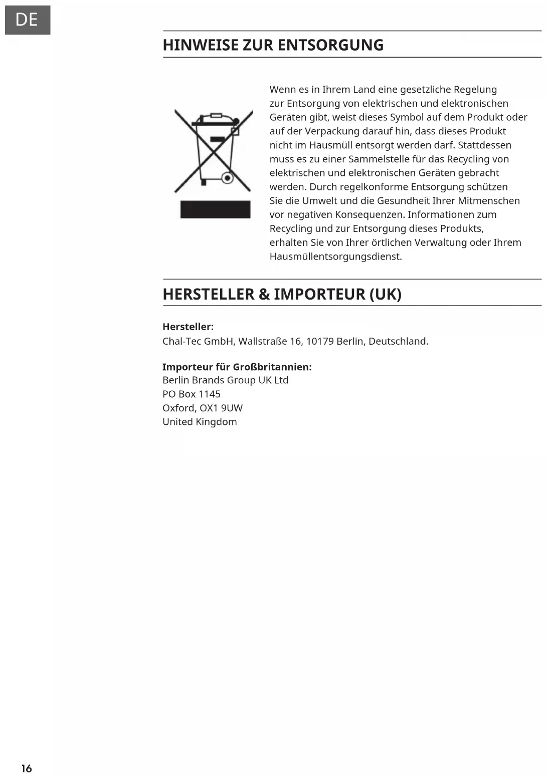 DISPOSAL CONSIDERATIONS If there is a legal regulation for the disposal of electrical and electronic devices in your country, this symbol on the product or on the packaging indicates that this product must not be disposed of with household waste. Instead, it must be taken to a collection point for the recycling of electrical and electronic equipment. By disposing of it in accordance with the rules, you are protecting the environment and the health of your fellow human beings from negative consequences. For information about the recycling and disposal of this product, please contact your local authority or your household waste disposal service. MANUFACTURER & IMPORTER (UK) Manufacturer: Chal-Tec GmbH, Wallstrasse 16, 10179 Berlin, Germany. Importer for Great Britain: Berlin Brands Group UK Ltd PO Box 1145 Oxford, OX1 9UW United Kingdom29