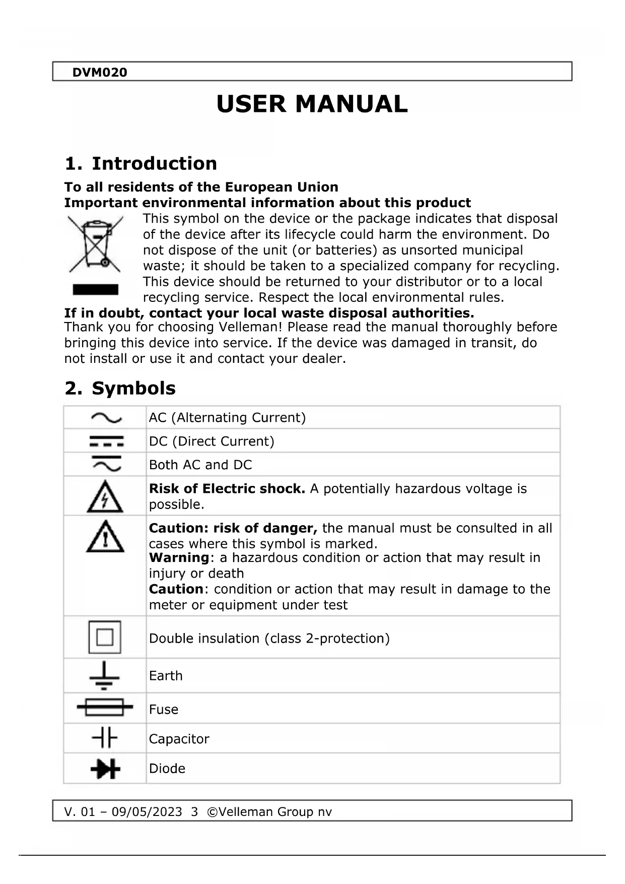 Download the instructions for your Multimeter in PDF format for free! Find your manual DVM020 - VELLEMAN and take your electronic device back in hand. On this page are published all the documents necessary for the use of your device. DVM020 by VELLEMAN.