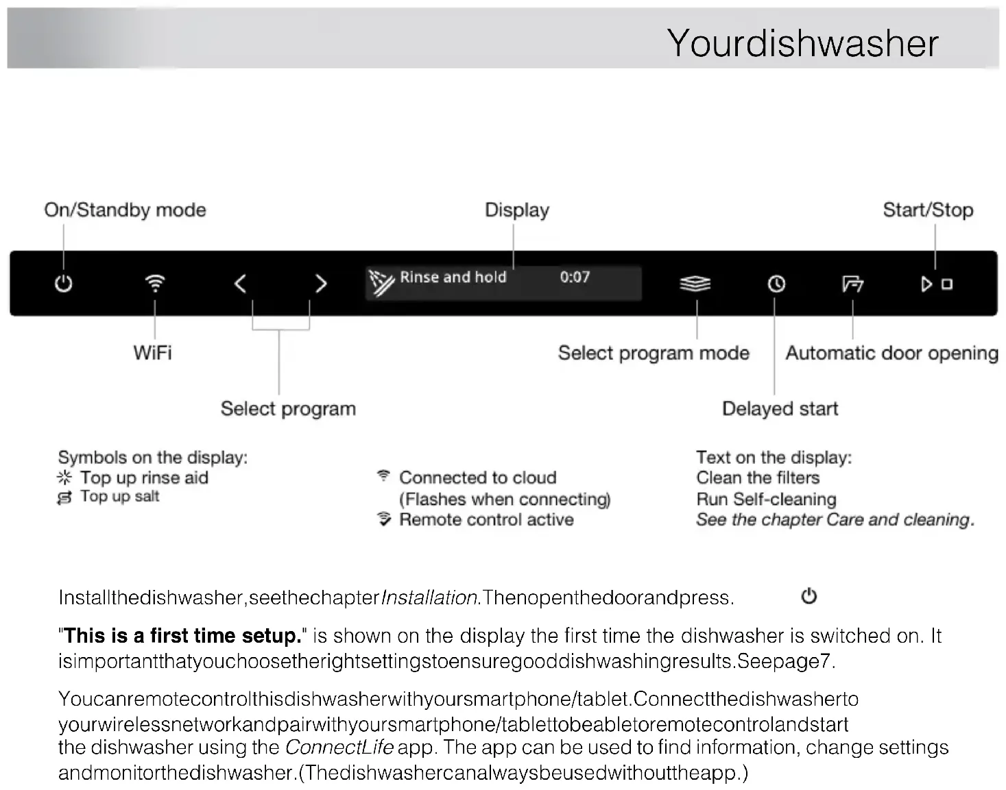 WiFi Display Start/StopOn/Standby mode Connect to a network and pair Connect the dishwasher to your wireless network and pair with your smartphone/tablet. (This can also be done from the dishwasher's Settings menu.)