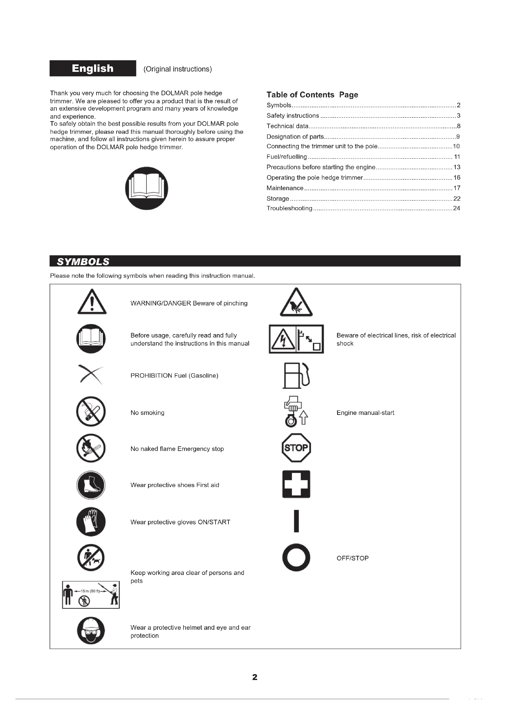 may cause respiratory or other illnesses. Some examples of these chemicals are compounds found in pesticides, insecticides, fertilizers and herbicides. Your risk from these exposures varies, depending on how often you do this type of work. To reduce your exposure to these chemicals: work in a well ventilated area, and work with approved safety equipment, such as those dust masks that are specially designed to lter out microscopic particles. SAFETY INSTRUCTIONS4 Starting the pole hedge trimmer - Before assembling or adjusting the equipment, switch off the engine and remove the spark plug cap. - Before starting the pole hedge trimmer, always make sure that the machine is in safe operational condition. - Never attempt to start the engine if the equipment is damaged. - Check the operation of the throttle lever safety mechanism. The lock-off lever should have a smooth and easy action. Make sure that the lock-off lever functions properly. Check that the handles are clean and dry and test the STOP switch to ensure that it is functioning properly. Always start the pole hedge trimmer in accordance with the directions provided in this instruction manual. Follow the instructions below to start the pole hedge trimmer - Start the pole hedge trimmer only after the machine has been completely assembled and all accessory parts have been attached. - When starting the engine, keep the blades clear of your body and other object, including the ground. The blades may move when starting and may cause serious injury or damage to the blades and/or property. - Before starting the engine, make sure that cutter blades are not obstructed by any foreign objects such as stones, branches, etc. - Stop the engine immediately if engine problems occur. - When pulling the starter knob, hold the equipment rmly against the ground by your left hand. Never step on the drive shaft. - If the blades move at idle, stop the engine and adjust the idle speed down. - When operating the pole hedge trimmer, always maintain a rm grip on both handles. Wrap your ngers tightly around each handle, cradling the handle between thumb and forenger. To keep the pole hedge trimmer under control at all times, avoid changing your grip during operation. Make sure that the control handles are in good condition and free of moisture, mud, oil or grease. Always ensure secure and well-balanced footing - Always stop the engine immediately and discontinue operation if engine trouble occurs or if the machine starts making unusual noise. - Exhaust fumes are poisonous. Never operate the machine in an enclosed room or tunnel without ventilation (risk of suffocation and gas poisoning). Note that carbon monoxide is an odorless gas. Always make sure that areas where the engine is operated are adequately ventilated. - Stop the engine when resting, or when the pole hedge trimmer is left unattended. Place the machine in a safe location and make sure that no combustible material is nearby. - Never place a hot pole hedge trimmer onto dry grass or combustible material. - To reduce the risk of re, keep the engine and mufer free of debris, leaves or excessive lubricant. - Never operate the engine if the mufer is malfunctioning. - Turn off the engine before transportation. - Always stop the engine when: