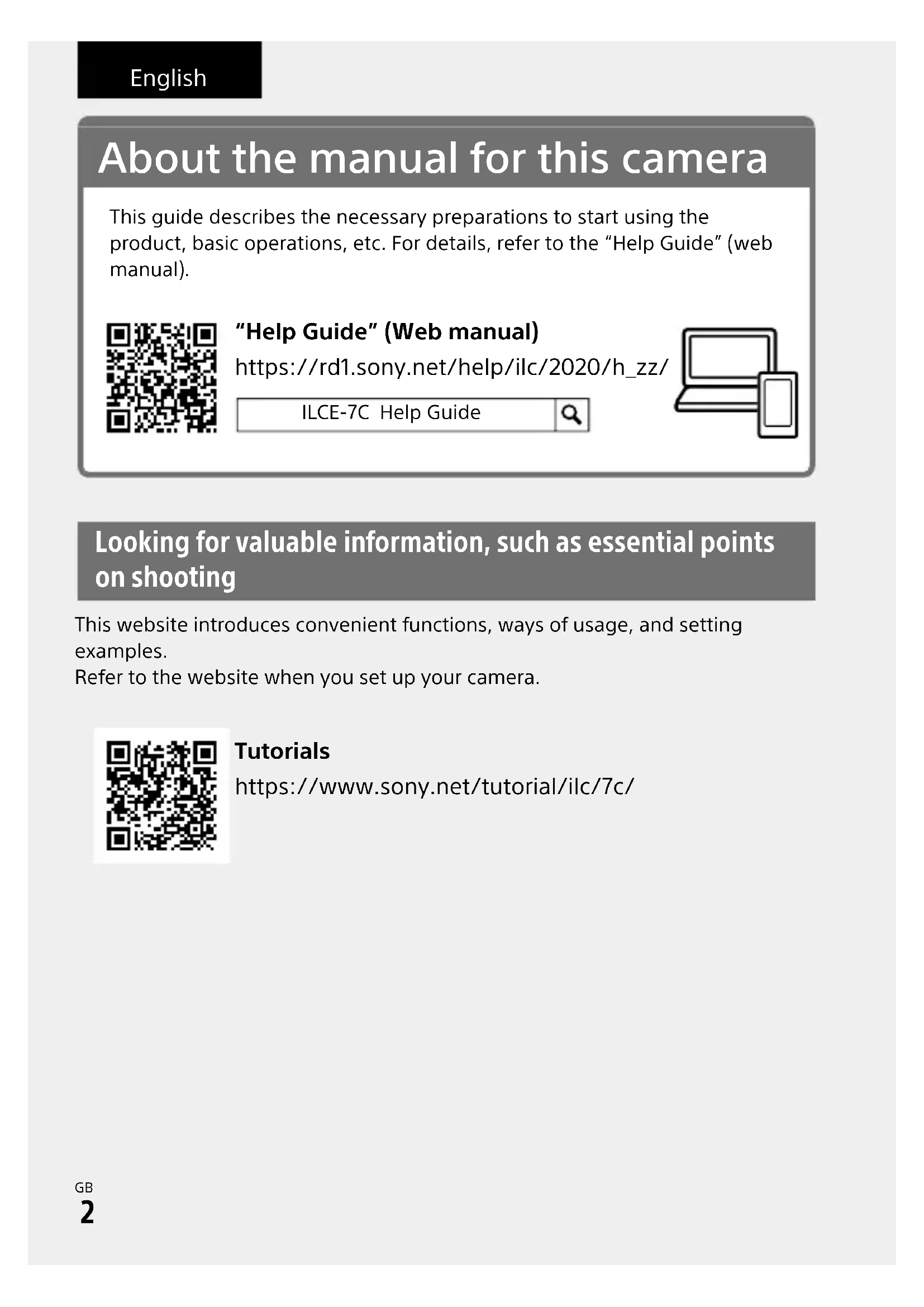 C:\Users\gotanda\Desktop\5021708411_GB_Book_Thailand\01GB-ILCE7CCEC\01GB.indd DTP data saved: 2020/06/26 10:35 PDF file created: 2020/06/26 10:36 English About the manual for this camera This guide describes the necessary preparations to start using the product, basic operations, etc. For details, refer to the “Help Guide” (web manual). https://rd1.sony.net/help/ilc/2020/h_zz/ “Help Guide” (Web manual) ILCE-7C Help Guide Looking for valuable information, such as essential points on shooting This website introduces convenient functions, ways of usage, and setting examples.Refer to the website when you set up your camera. Tutorials https://www.sony.net/tutorial/ilc/7c/ILCE-7C5-021-708-41(1)