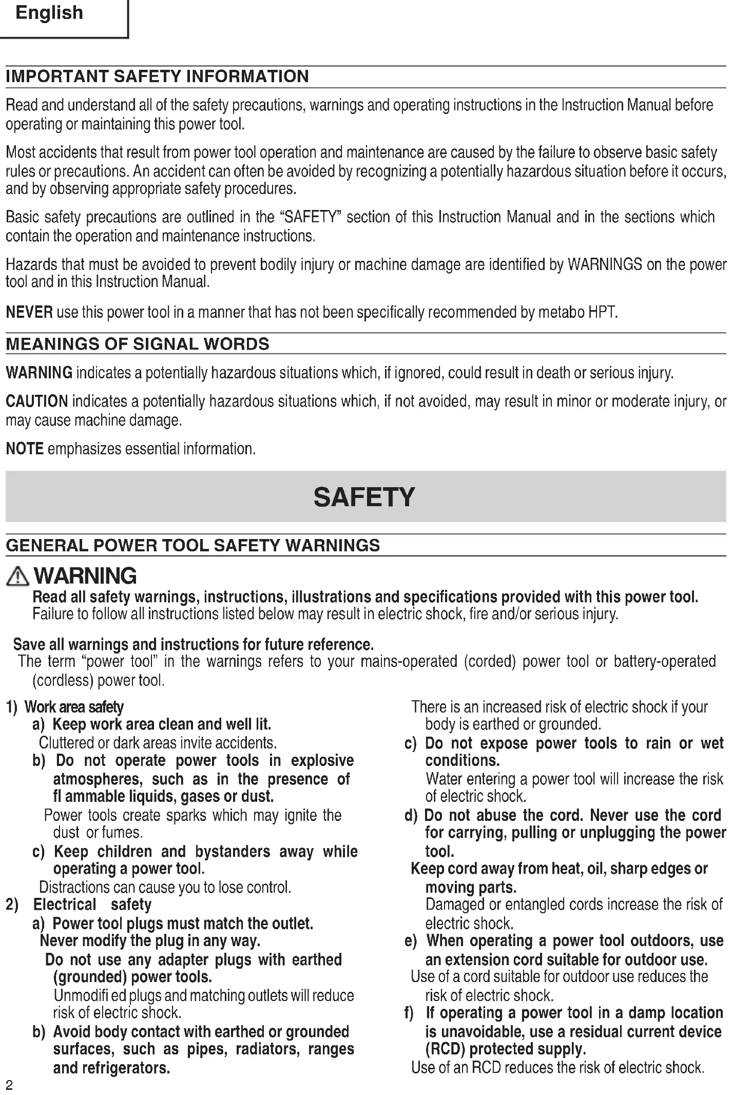 All quality power tools will eventually require servicing or replacement of parts because of wear from normal use. To assure that only authorized replacement parts will be used, all service and repairs must be performed by a metabo HPT AUTHORIZED SERVICE CENTER, ONLY. CAUTION In the operation and maintenance of power tools, the safety regulations and standards prescribed in each country must be observed. Important notice on the batteries for the metabo HPT cordless power tools Please always use one of our designated genuine batteries. We cannot guarantee the safety and performance of our cordless power tool when used with batteries other than these designated by us, or when the battery is disassembled and modifi ed (such as disassembly and replacement of cells or other internal parts).