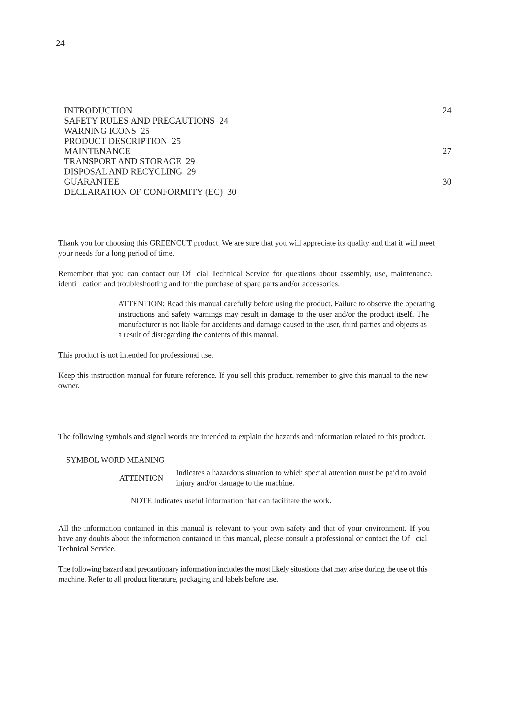 INTRODUCTION Thank you for choosing this GREENCUT product. We are sure that you will appreciate its quality and that it will meet your needs for a long period of time. Remember that you can contact our Ofcial Technical Service for questions about assembly, use, maintenance, identication and troubleshooting and for the purchase of spare parts and/or accessories. ATTENTION: Read this manual carefully before using the product. Failure to observe the operating instructions and safety warnings may result in damage to the user and/or the product itself. The manufacturer is not liable for accidents and damage caused to the user, third parties and objects as a result of disregarding the contents of this manual. This product is not intended for professional use. Keep this instruction manual for future reference. If you sell this product, remember to give this manual to the new owner.