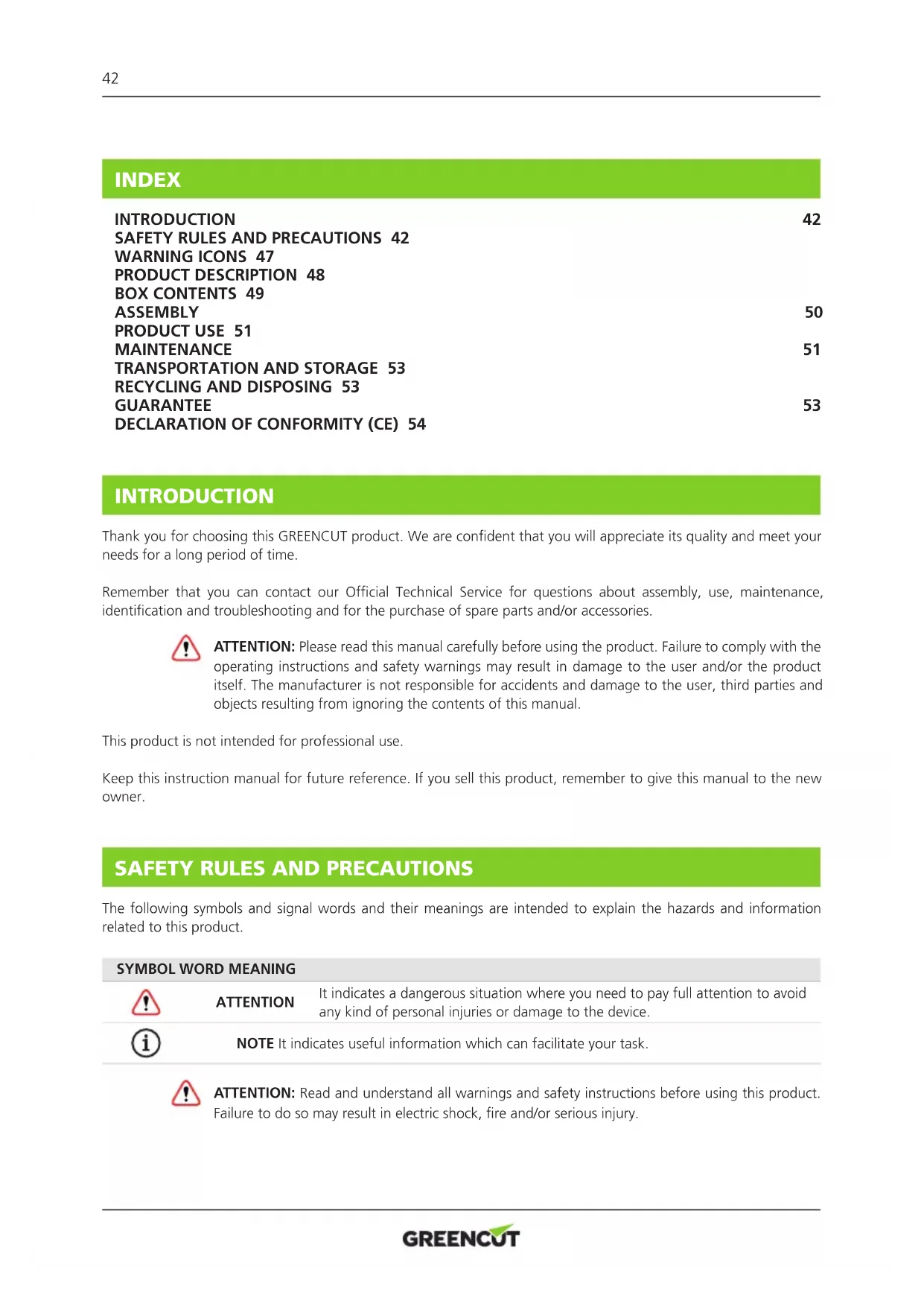 - Direttiva 2014/30/UE del Parlamento europeo e del Consiglio, del 26 febbraio 2014, concernente l’armonizzazione delle legislazioni degli Stati membri relative alla compatibilità elettromagnetica (rifusione). Il prodotto consegnato corrisponde al modello che fu sottoposto all’esame CE del tipo. Valls (SPAIN), 9 March 2021, Albert Prat Asensio, FOUNDER (Représentant autorisé et responsable de la documentation technique).42 INTRODUCTION Thank you for choosing this GREENCUT product. We are condent that you will appreciate its quality and meet your needs for a long period of time. Remember that you can contact our Ofcial Technical Service for questions about assembly, use, maintenance, identication and troubleshooting and for the purchase of spare parts and/or accessories. ATTENTION: Please read this manual carefully before using the product. Failure to comply with the operating instructions and safety warnings may result in damage to the user and/or the product itself. The manufacturer is not responsible for accidents and damage to the user, third parties and objects resulting from ignoring the contents of this manual. This product is not intended for professional use. Keep this instruction manual for future reference. If you sell this product, remember to give this manual to the new owner.