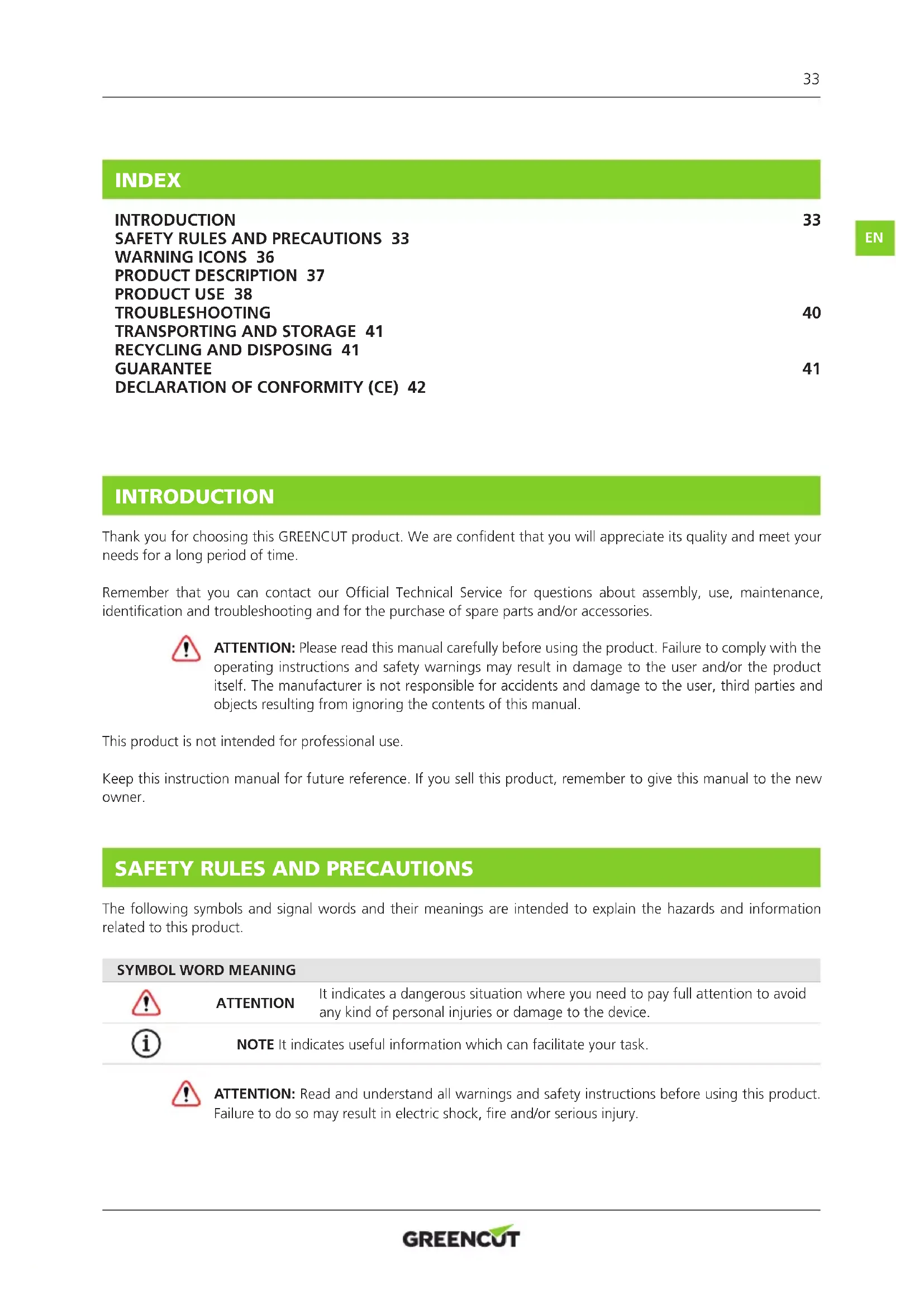 INTRODUCTION Thank you for choosing this GREENCUT product. We are condent that you will appreciate its quality and meet your needs for a long period of time. Remember that you can contact our Ofcial Technical Service for questions about assembly, use, maintenance, identication and troubleshooting and for the purchase of spare parts and/or accessories. ATTENTION: Please read this manual carefully before using the product. Failure to comply with the operating instructions and safety warnings may result in damage to the user and/or the product itself. The manufacturer is not responsible for accidents and damage to the user, third parties and objects resulting from ignoring the contents of this manual. This product is not intended for professional use. Keep this instruction manual for future reference. If you sell this product, remember to give this manual to the new owner.