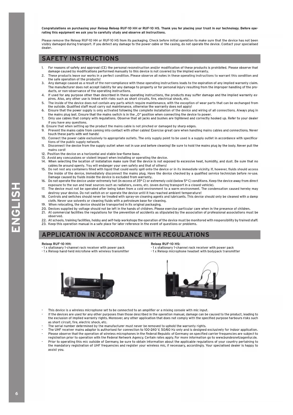 Reloop RUF-10 HH: - 1 x stationary 1-channel rack receiver with power pack - 1 x Reloop hand-held microfone with wireless transmitter Reloop RUF-10 HS: - 1 x stationary 1-channel rack receiver with power pack - 1 x Reloop microphone headset with bodypack transmitter - This device is a wireless microphone set to be connected to an amplier or a mixing console with mic input. - If the devices are used for any other purposes than those described in the operation manual, damage can be caused to the product, leading to the exclusion of implied warranty rights. Moreover, any other application that does not comply with the specied purpose harbours risks such as short circuit, re, electric shock, etc. - The serial number determined by the manufacturer must never be removed to uphold the warranty rights. - The UHF receiver mains adaptor is authorised for connection to 100-240 V, 50/60 Hz only and is designed exclusively for indoor application. - Please observe that the operation of wireless microphones in the Federal Republic of Germany on specied carrier frequencies are subject to registration prior to operation with the Federal Network Agency. Certain rates apply. For more information go to www.bundesnetzagentur.de. - Prior to operating this mic outside of Germany, be sure to obtain information about the applicable regulations of your country pertaining to the mandatory registration of UHF frequencies and register your wireless mic, if necessary, accordingly. Your specialised dealer is happy to assist you. ENGLISH7 OPERATING ENVIRONMENT The products must be operated and stored in a dry environment only! Splash water, rain, humidity, fog may cause serious damage. The limit value for relative humidity is 50% at 45°C. The products must be operated at a temperature range of between 5 °C and 35 °C only. Protect the products against direct exposure to sunlight or other heat, such as from radiators! If the products are taken from a cold environment into a warm environment they must only be taken into operation once they have reached ambi- ent temperature, since the condensation created by the difference in temperature may destroy the products!Protect the products against dust! OPERATION ControlsFront side UHF receiver RUF-10 HH, RUF-10 HSRear panel UHF receiver RUF-10 HH, RUF-10 HS1. ON/OFF Button2. IR Signal Display3. LCD (Group & Channel; RF & AF Display)4. Select Button: selects between the various display modes5. Menu Button: selects the menu layer6. Sync Button: connects receiver and transmitter7. Volume: adjusts volume level8. Aerial Terminal: connection for the included aerials9. Individually balanced XLR output10. 6.3mm Jack Connection11. Mic/Line Select Switch12. Connection for Power SupplyRUF-10 HH Handheld Microphone1. Exchangeable Microphone Head2. Status LED: green: ready; orange: mute on; blinking: connection is being carried out3. LCD: Groups/Channel No.; Battery Display4. On/Off/Mute: press 2 seconds to turn on/off; press briey for mute on/off5. Select: manual adjustment of radio channel6. Battery Protection: revolvable7. IR Port ENGLISH