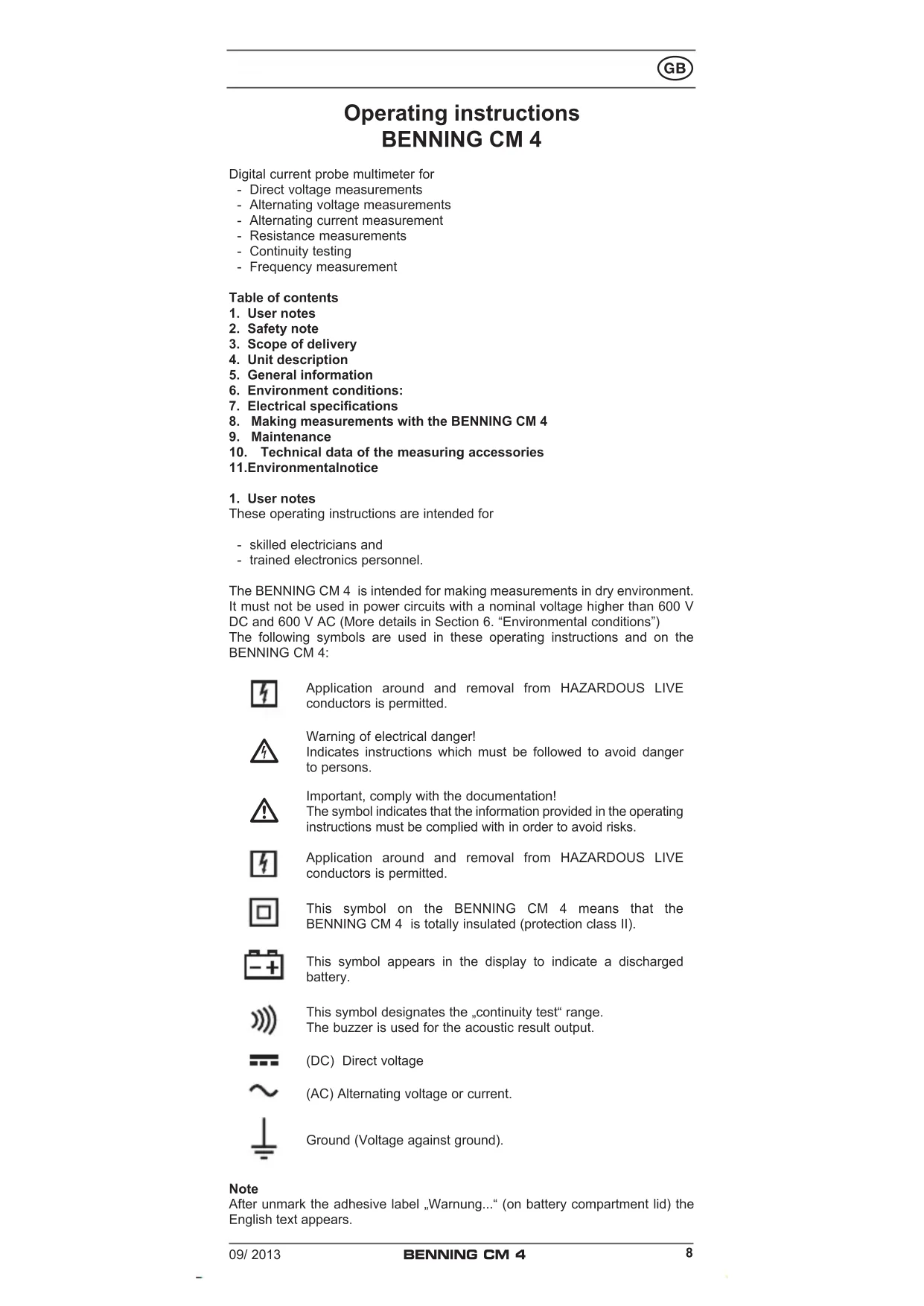 Important, comply with the documentation! The symbol indicates that the information provided in the operating instructions must be complied with in order to avoid risks. Application around and removal from HAZARDOUS LIVE conductors is permitted. This symbol on the BENNING CM 4 means that the BENNING CM 4 is totally insulated (protection class II). This symbol appears in the display to indicate a discharged battery. This symbol designates the „continuity test“ range. The buzzer is used for the acoustic result output. (DC) Direct voltage (AC) Alternating voltage or current. Ground (Voltage against ground). Note After unmark the adhesive label „Warnung...“ (on battery compartment lid) the English text appears.09/ 2013 BENNING CM 4