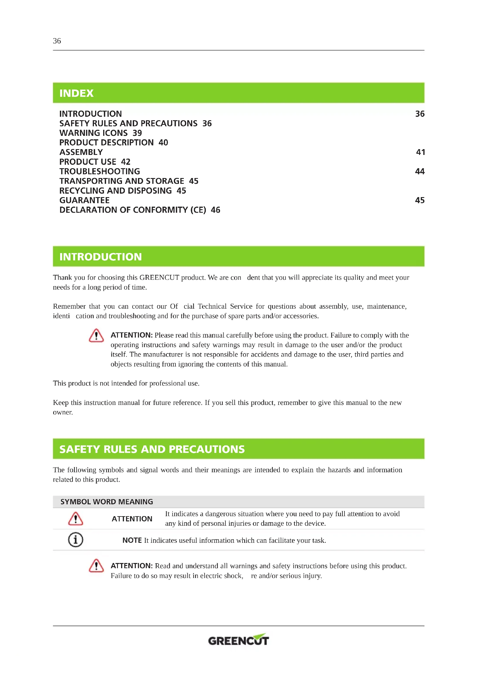 ATTENTION It indicates a dangerous situation where you need to pay full attention to avoid any kind of personal injuries or damage to the device. NOTE It indicates useful information which can facilitate your task. ATTENTION: Read and understand all warnings and safety instructions before using this product. Failure to do so may result in electric shock, re and/or serious injury. INDEX INTRODUCTION 36