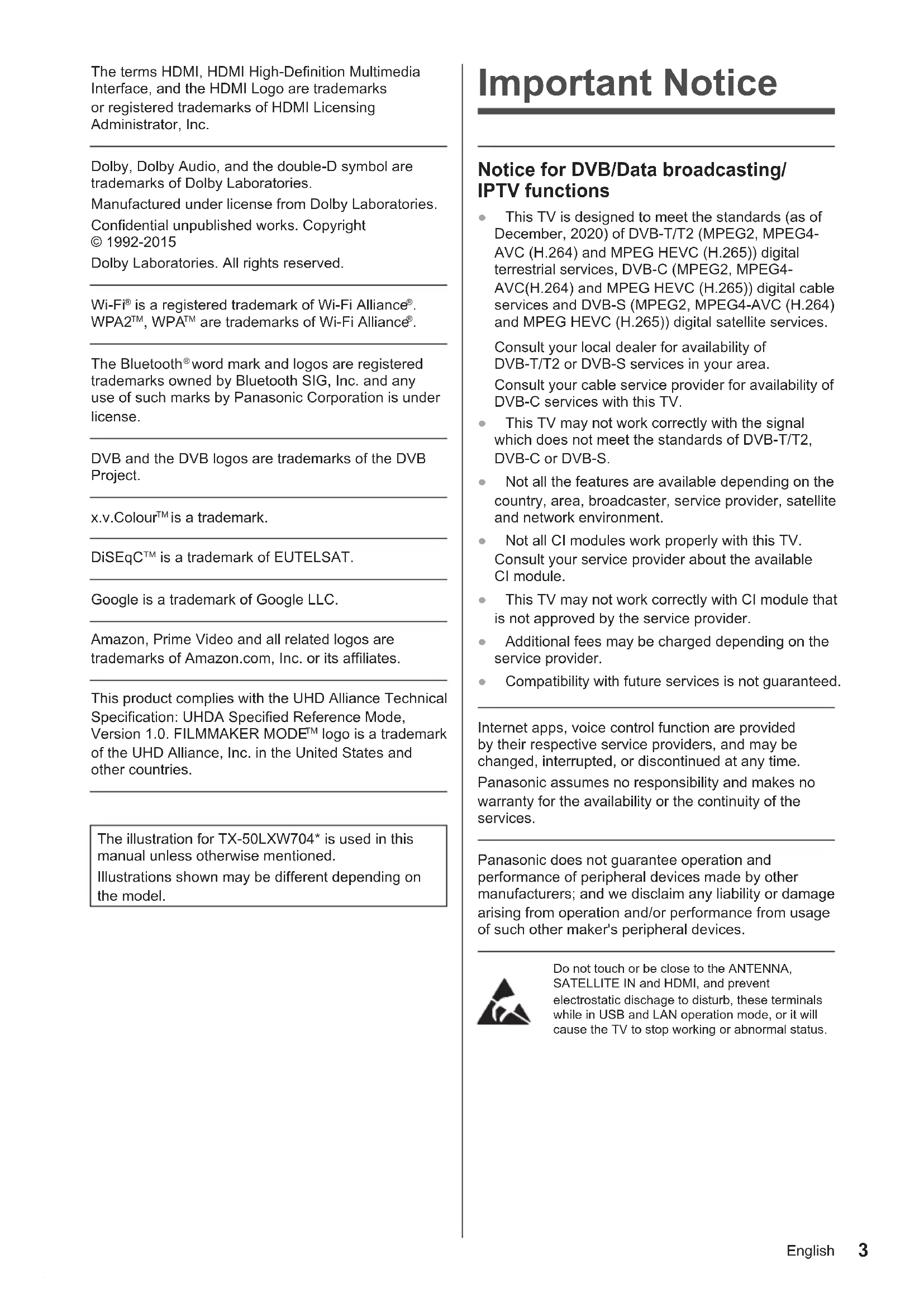 logo is a trademark of the UHD Alliance, Inc. in the United States and other countries. The illustration for TX-50LXW704* is used in this manual unless otherwise mentioned. Illustrations shown may be different depending on the model. Important Notice Notice for DVB/Data broadcasting/ IPTV functions ● This TV is designed to meet the standards (as of December, 2020) of DVB-T/T2 (MPEG2, MPEG4- AVC (H.264) and MPEG HEVC (H.265)) digital terrestrial services, DVB-C (MPEG2, MPEG4- AVC(H.264) and MPEG HEVC (H.265)) digital cable services and DVB-S (MPEG2, MPEG4-AVC (H.264) and MPEG HEVC (H.265)) digital satellite services. Consult your local dealer for availability of DVB-T/T2 or DVB-S services in your area. Consult your cable service provider for availability of DVB-C services with this TV. ● This TV may not work correctly with the signal which does not meet the standards of DVB-T/T2, DVB-C or DVB-S. ● Not all the features are available depending on the country, area, broadcaster, service provider, satellite and network environment. ● Not all CI modules work properly with this TV. Consult your service provider about the available CI module. ● This TV may not work correctly with CI module that is not approved by the service provider. ● Additional fees may be charged depending on the service provider. ● Compatibility with future services is not guaranteed. Internet apps, voice control function are provided by their respective service providers, and may be changed, interrupted, or discontinued at any time. Panasonic assumes no responsibility and makes no warranty for the availability or the continuity of the services. Panasonic does not guarantee operation and performance of peripheral devices made by other manufacturers; and we disclaim any liability or damage arising from operation and/or performance from usage of such other maker's peripheral devices. Do not touch or be close to the ANTENNA, SATELLITE IN and HDMI, and prevent electrostatic dischage to disturb, these terminals while in USB and LAN operation mode, or it will cause the TV to stop working or abnormal status.English