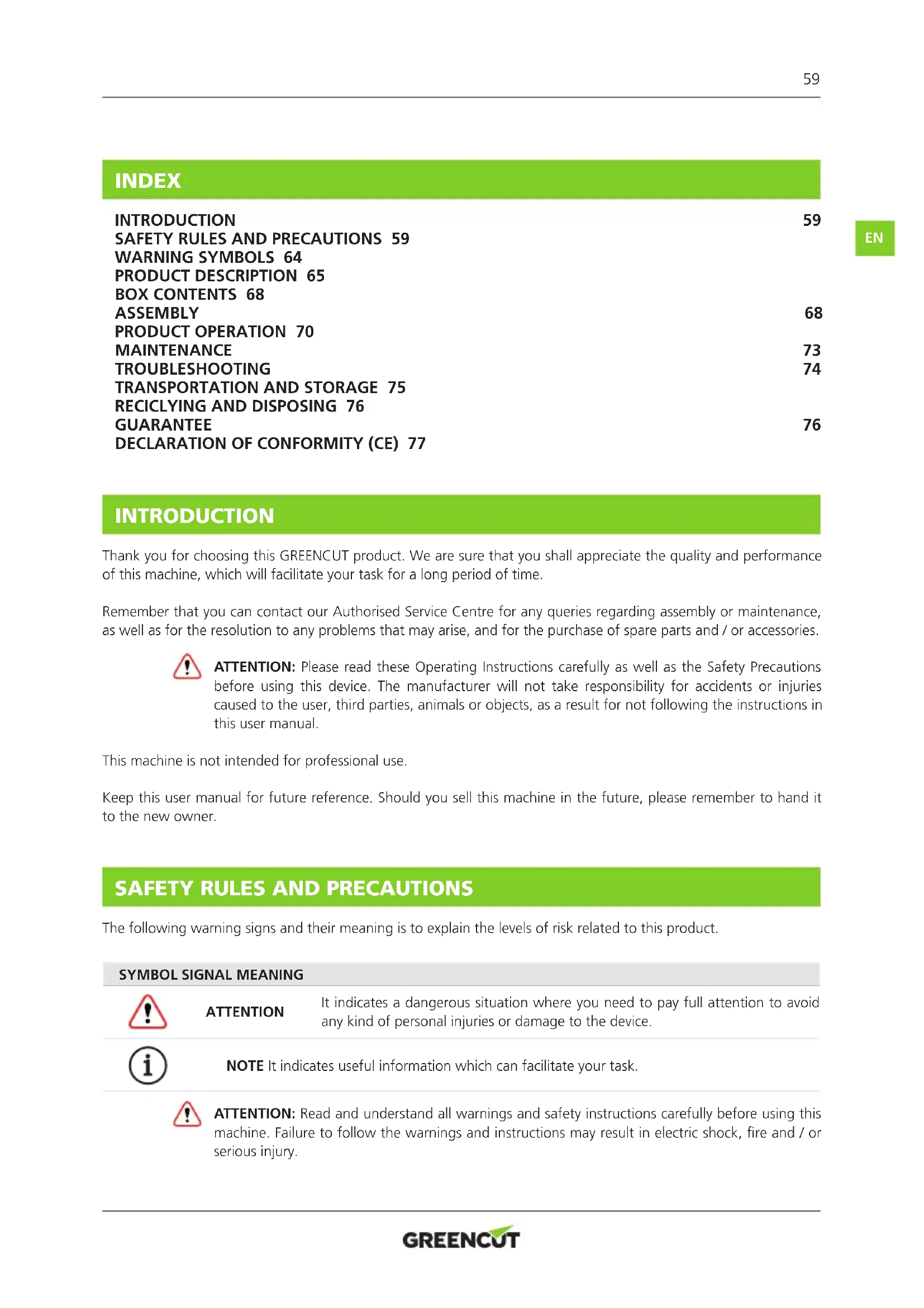 INTRODUCTION Thank you for choosing this GREENCUT product. We are sure that you shall appreciate the quality and performance of this machine, which will facilitate your task for a long period of time. Remember that you can contact our Authorised Service Centre for any queries regarding assembly or maintenance, as well as for the resolution to any problems that may arise, and for the purchase of spare parts and / or accessories. ATTENTION: Please read these Operating Instructions carefully as well as the Safety Precautions before using this device. The manufacturer will not take responsibility for accidents or injuries caused to the user, third parties, animals or objects, as a result for not following the instructions in this user manual. This machine is not intended for professional use. Keep this user manual for future reference. Should you sell this machine in the future, please remember to hand it to the new owner.