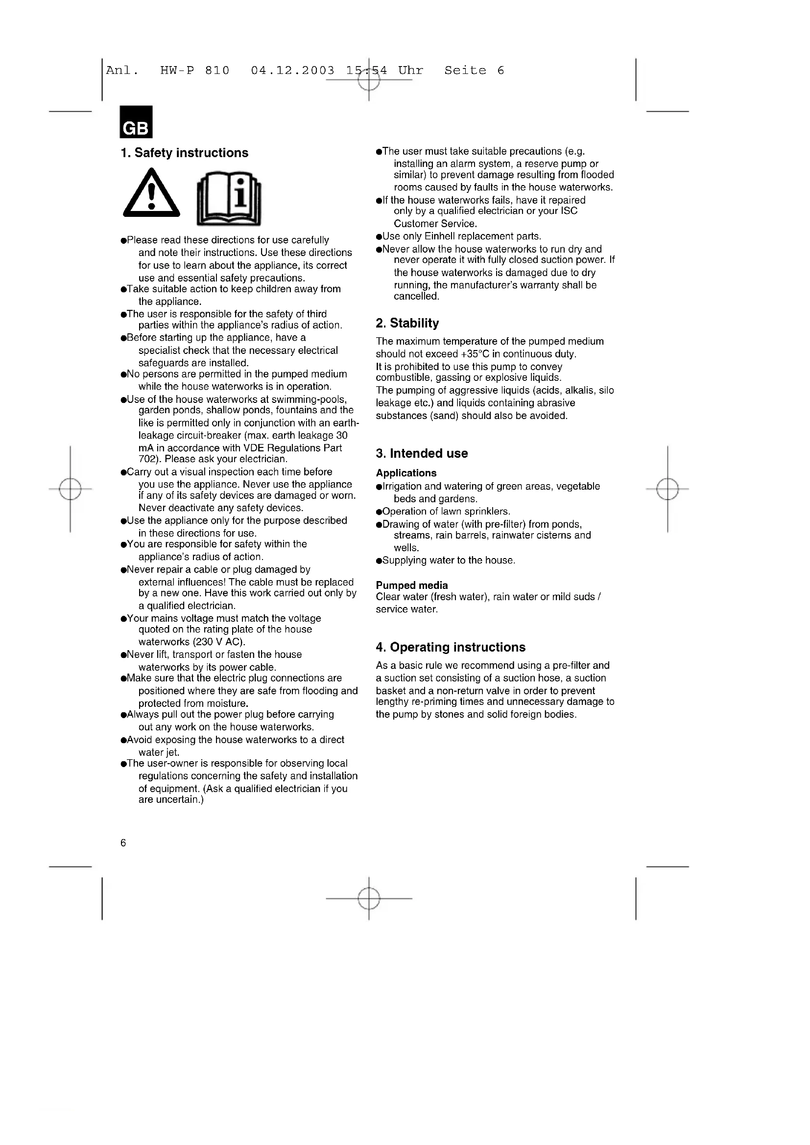 Please read these directions for use carefully and note their instructions. Use these directions for use to learn about the appliance, its correct use and essential safety precautions. Take suitable action to keep children away from the appliance. The user is responsible for the safety of third parties within the appliance’s radius of action. Before starting up the appliance, have a specialist check that the necessary electrical safeguards are installed. No persons are permitted in the pumped medium while the house waterworks is in operation. Use of the house waterworks at swimming-pools, garden ponds, shallow ponds, fountains and the like is permitted only in conjunction with an earth- leakage circuit-breaker (max. earth leakage 30 mA in accordance with VDE Regulations Part 702). Please ask your electrician. Carry out a visual inspection each time before you use the appliance. Never use the appliance if any of its safety devices are damaged or worn. Never deactivate any safety devices. Use the appliance only for the purpose described in these directions for use. You are responsible for safety within the appliance’s radius of action. Never repair a cable or plug damaged by external influences! The cable must be replaced by a new one. Have this work carried out only by a qualified electrician. Your mains voltage must match the voltage quoted on the rating plate of the house waterworks (230 V AC). Never lift, transport or fasten the house waterworks by its power cable. Make sure that the electric plug connections are positioned where they are safe from flooding and protected from moisture. Always pull out the power plug before carrying out any work on the house waterworks. Avoid exposing the house waterworks to a direct water jet. The user-owner is responsible for observing local regulations concerning the safety and installation of equipment. (Ask a qualified electrician if you are uncertain.) The user must take suitable precautions (e.g. installing an alarm system, a reserve pump or similar) to prevent damage resulting from flooded rooms caused by faults in the house waterworks. If the house waterworks fails, have it repaired only by a qualified electrician or your ISC Customer Service. Use only Einhell replacement parts. Never allow the house waterworks to run dry and never operate it with fully closed suction power. If the house waterworks is damaged due to dry running, the manufacturer’s warranty shall be cancelled.
