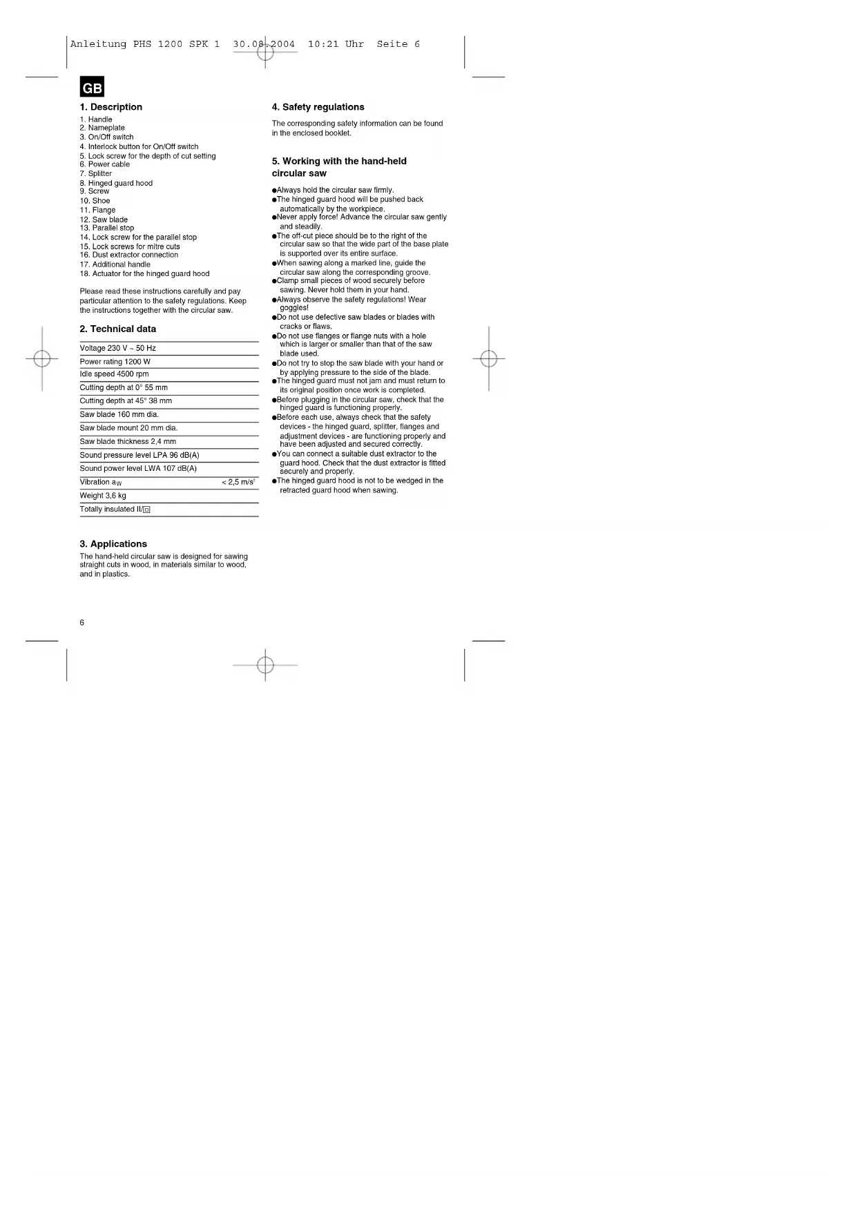 Important!Wear ear muffs and goggles.Parallel cuts1. Release the lock screw 1.2. For 90° cuts, adjust the parallel stop 2 using the scale on groove A, for 45° cuts adjust the parallel stop 2 using the scale on groove B. Observe the saw blade width.3. Tighten the lock screw.Important!First make a trial cut. Adjustment of the cutting depth1. Release the lock screw.2. Swing the shoe downwards.3. Adjust the cutting depth using the scale.The saw teeth must project approx. 2 mm out of the wood.4. Tighten the lock screw. Adjustment of the shoe (cutting angle)1. Release the lock screw 12. Adjust the shoe to the desired angle between 0 and 45°.3. Tighten the lock screw 1. Anleitung PHS 1200 SPK 1 30.08.2004 10:21 Uhr Seite 73