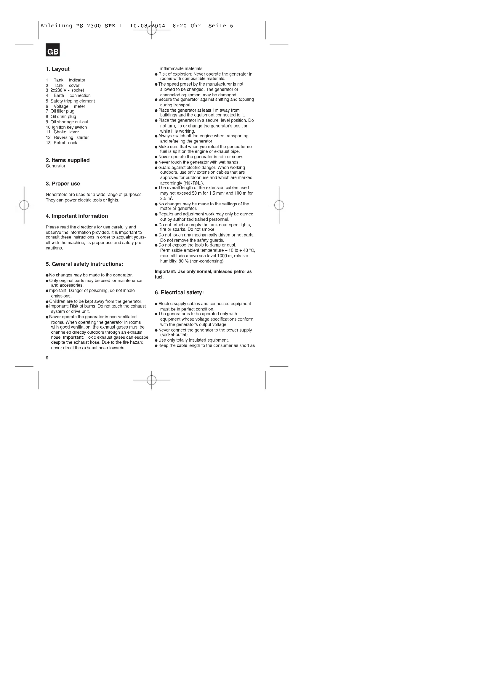 No changes may be made to the generator. Only original parts may be used for maintenance and accessories. mportant: Danger of poisoning, do not inhale emissions. Children are to be kept away from the generator. Important: Risk of burns. Do not touch the exhaust system or drive unit. Never operate the generator in non-ventilated rooms. When operating the generator in rooms with good ventilation, the exhaust gases must be channeled directly outdoors through an exhaust hose. Important: Toxic exhaust gases can escape despite the exhaust hose. Due to the fire hazard, never direct the exhaust hose towards inflammable materials. Risk of explosion: Never operate the generator in rooms with combustible materials. The speed preset by the manufacturer is not allowed to be changed. The generator or connected equipment may be damaged. Secure the generator against shifting and toppling during transport. Place the generator at least 1m away from buildings and the equipment connected to it. Place the generator in a secure, level position. Do not turn, tip or change the generator's position while it is working. Always switch off the engine when transporting and refueling the generator. Make sure that when you refuel the generator no fuel is spilt on the engine or exhaust pipe. Never operate the generator in rain or snow. Never touch the generator with wet hands. Guard against electric danger. When working outdoors, use only extension cables that are approved for outdoor use and which are marked accordingly (H07RN..). The overall length of the extension cables used may not exceed 50 m for 1.5 mm