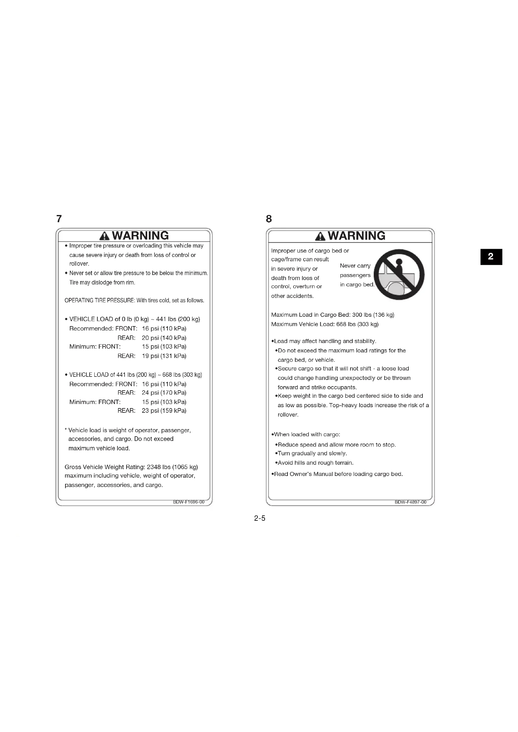Improper tire pressure or overloading this vehicle maycause severe injury or death from loss of control orrollover. Never set or allow tire pressure to be below the minimum.Tire may dislodge from rim.• VEHICLE LOAD of 0 lb (0 kg) ~ 441 lbs (200 kg)Recommended: FRONT:REAR:Minimum: FRONT:REAR:16 psi (110 kPa)20 psi (140 kPa)15 psi (103 kPa)19 psi (131 kPa) VEHICLE LOAD of 441 lbs (200 kg) ~ 668 lbs (303 kg)Recommended: FRONT:REAR:Minimum: FRONT:REAR:16 psi (110 kPa)24 psi (170 kPa)15 psi (103 kPa)23 psi (159 kPa) Vehicle load is weight of operator, passenger,accessories, and cargo. Do not exceedmaximum vehicle load.Gross Vehicle Weight Rating: 2348 lbs (1065 kg)maximum including vehicle, weight of operator,passenger, accessories, and cargo.OPERATING TIRE PRESSURE: With tires cold, set as follows.BDW-F4897-00 WARNING
