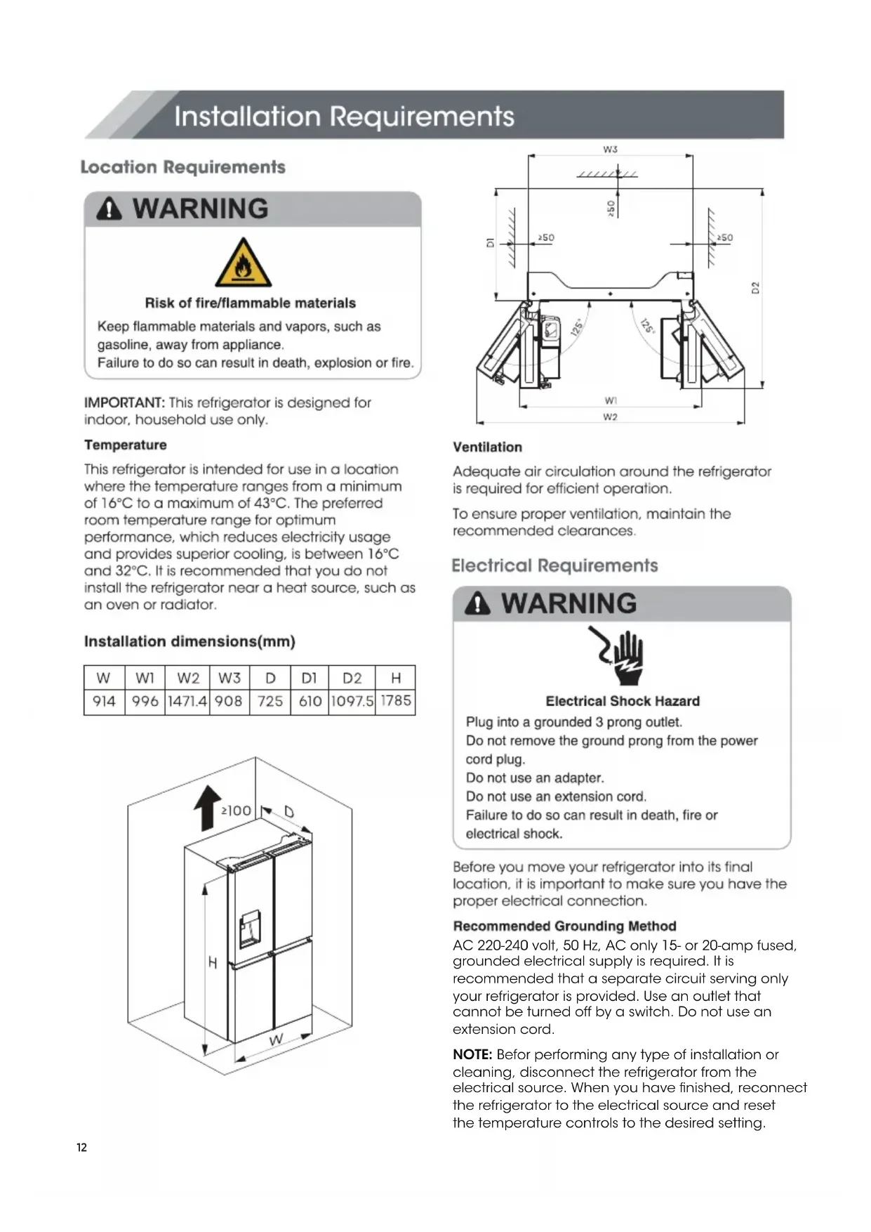 Water storage box12 AC 220-240 volt, 50 Hz, AC only 15- or 20-amp fused, grounded electrical supply is required. It is recommended that a separate circuit serving only your refrigerator is provided. Use an outlet that cannot be turned off by a switch. Do not use an extension cord. NOTE: Befor performing any type of installation or cleaning, disconnect the refrigerator from the electrical source. When you have finished, reconnect the refrigerator to the electrical source and reset the temperature controls to the desired setting.Unpack the Refrigerator Door Removal (only if needed)