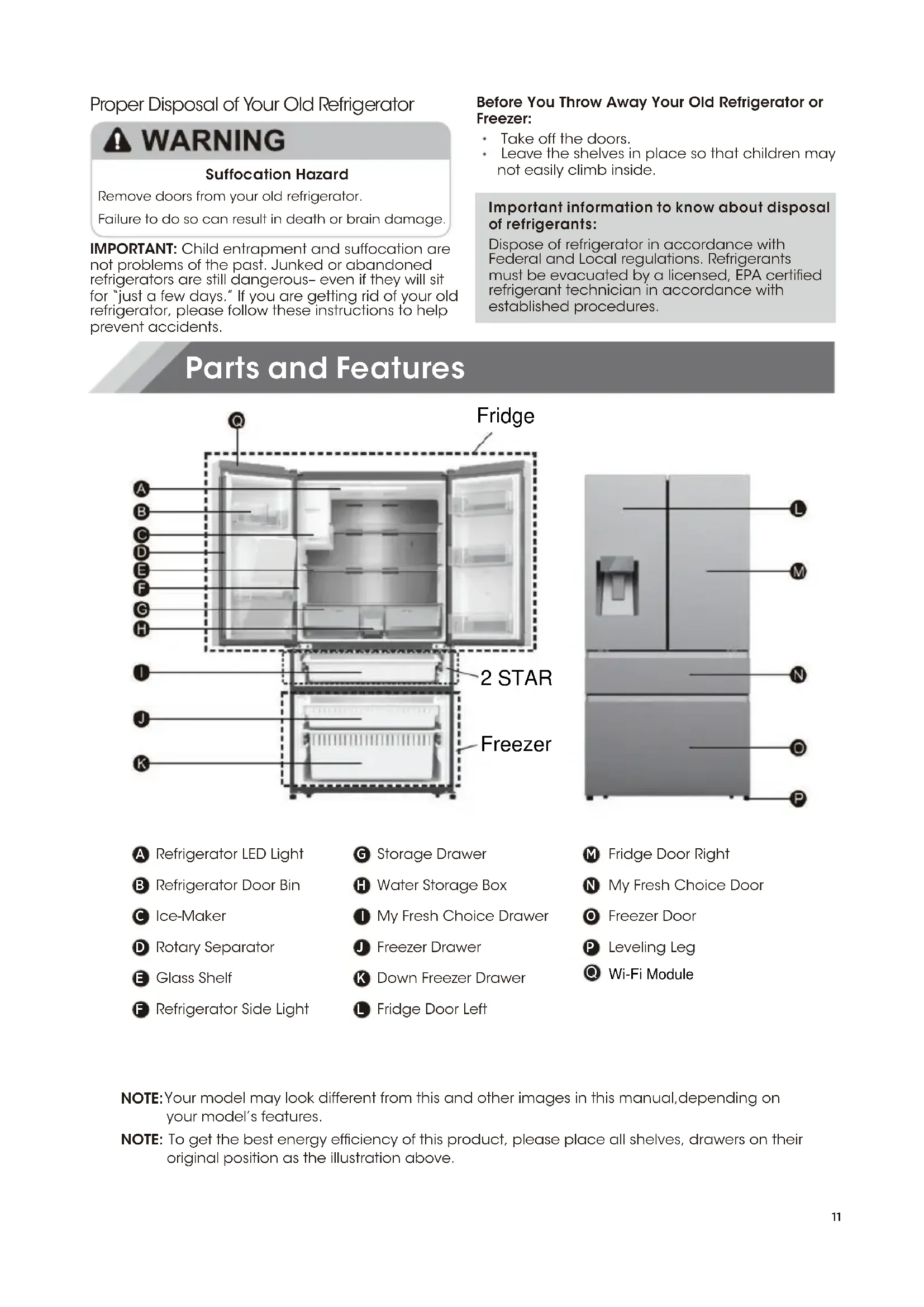 - TROUBLESHOOTING YYour model may look different from this and other images in this manual,depending on your model’s features. Parts and Features Proper Disposal of Your Old Refrigerator Remove doors from your old refrigerator.Failure to do so can result in death or brain damage. Suffocation Hazard IMPORTANT: Child entrapment and suffocation are not problems of the past. Junked or abandoned refrigerators are still dangerous– even if they will sit for “just a few days.” If you are getting rid of your old refrigerator, please follow these instructions to help prevent accidents. Before You Throw Away Your Old Refrigerator or Freezer: Take off the doors. Leave the shelves in place so that children may not easily climb inside. Important information to know about disposal of refrigerants: Dispose of refrigerator in accordance with Federal and Local regulations. Refrigerants must be evacuated by a licensed, EPA certified refrigerant technician in accordance with established procedures. p. 29