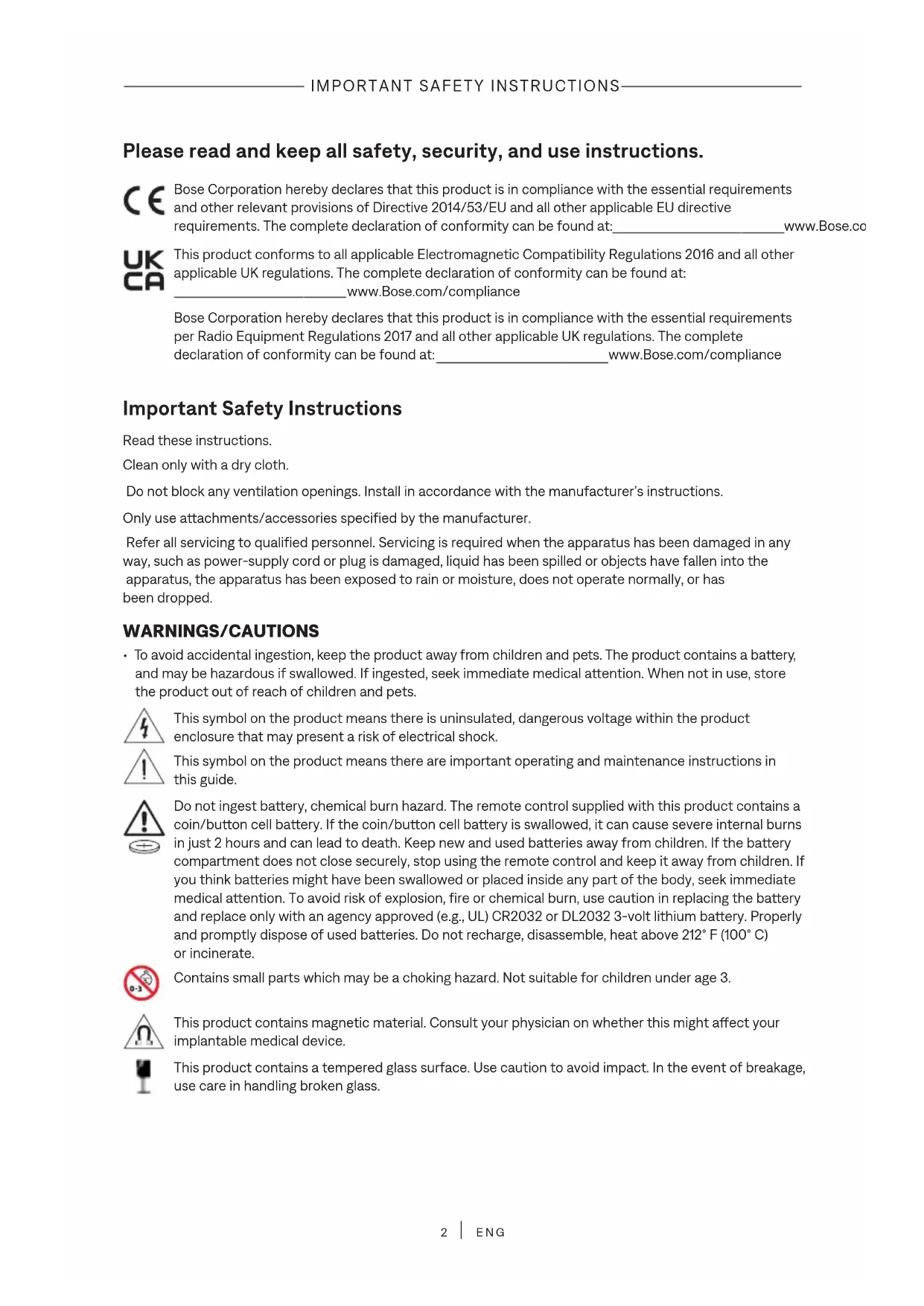 ENG Please read and keep all safety, security, and use instructions. Bose Corporation hereby declares that this product is in compliance with the essential requirements and other relevant provisions of Directive 2014/53/EU and all other applicable EU directive requirements. The complete declaration of conformity can be found at: www.Bose.com/compliancewww.Bose.com/compliance This product conforms to all applicable Electromagnetic Compatibility Regulations 2016 and all other applicable UK regulations. The complete declaration of conformity can be found at: www.Bose.com/compliancewww.Bose.com/compliance Bose Corporation hereby declares that this product is in compliance with the essential requirements per Radio Equipment Regulations 2017 and all other applicable UK regulations. The complete declaration of conformity can be found at: www.Bose.com/compliancewww.Bose.com/compliance Important Safety Instructions Read these instructions. Clean only with a dry cloth. Do not block any ventilation openings. Install in accordance with the manufacturer’s instructions. Only use aachments/accessories specified by the manufacturer. Refer all servicing to qualified personnel. Servicing is required when the apparatus has been damaged in any way, such as power-supply cord or plug is damaged, liquid has been spilled or objects have fallen into the apparatus, the apparatus has been exposed to rain or moisture, does not operate normally, or has been dropped. WARNINGS/CAUTIONS