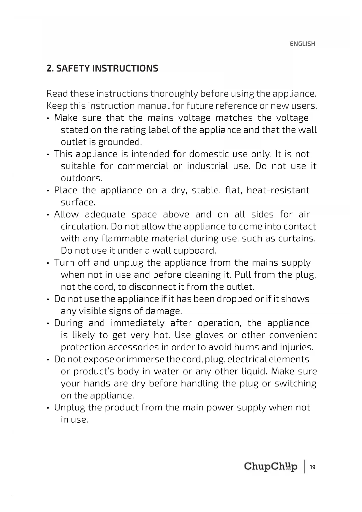 - Turn off and unplug the appliance from the mains supply when not in use and before cleaning it. Pull from the plug, not the cord, to disconnect it from the outlet.