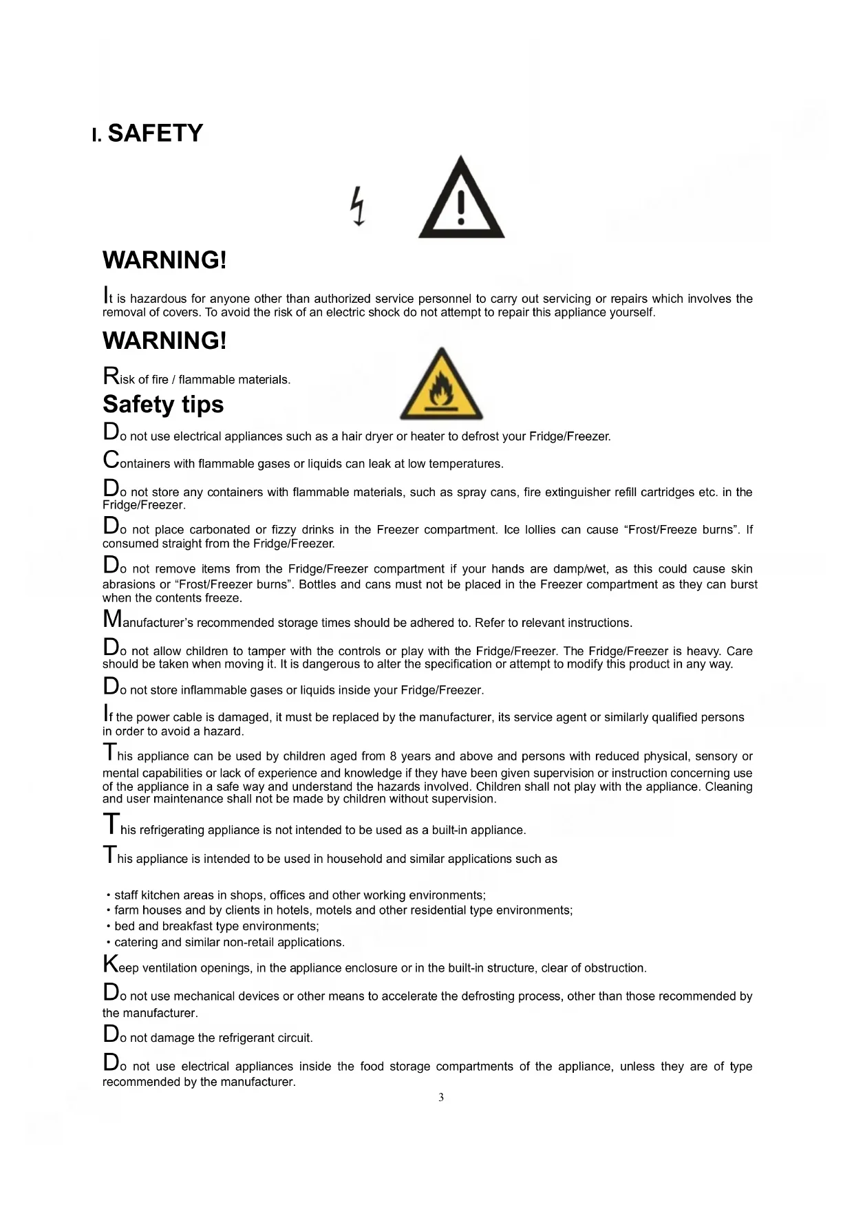 o not use electrical appliances such as a hair dryer or heater to defrost your Fridge/Freezer. Containers with flammable gases or liquids can leak at low temperatures. Do not store any containers with flammable materials, such as spray cans, fire extinguisher refill cartridges etc. in the Fridge/Freezer. Do not place carbonated or fizzy drinks in the Freezer compartment. Ice lollies can cause “Frost/Freeze burns”. If consumed straight from the Fridge/Freezer. Do not remove items from the Fridge/Freezer compartment if your hands are damp/wet, as this could cause skin abrasions or “Frost/Freezer burns”. Bottles and cans must not be placed in the Freezer compartment as they can burst when the contents freeze. Manufacturer’s recommended storage times should be adhered to. Refer to relevant instructions. Do not allow children to tamper with the controls or play with the Fridge/Freezer. The Fridge/Freezer is heavy. Care should be taken when moving it. It is dangerous to alter the specification or attempt to modify this product in any way. Do not store inflammable gases or liquids inside your Fridge/Freezer. If the power cable is damaged, it must be replaced by the manufacturer, its service agent or similarly qualified persons in order to avoid a hazard. This appliance can be used by children aged from 8 years and above and persons with reduced physical, sensory or mental capabilities or lack of experience and knowledge if they have been given supervision or instruction concerning use of the appliance in a safe way and understand the hazards involved. Children shall not play with the appliance. Cleaning and user maintenance shall not be made by children without supervision. This refrigerating appliance is not intended to be used as a built-in appliance. This appliance is intended to be used in household and similar applications such as