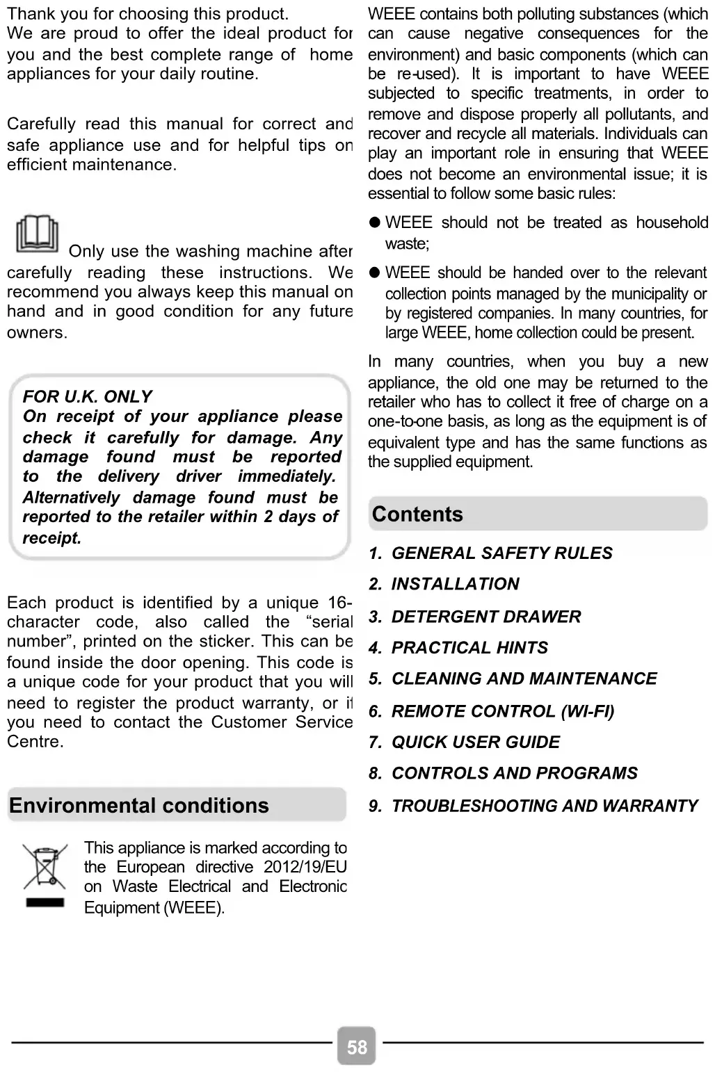 Only use the washing machine after carefully reading these instructions. We recommend you always keep this manual on hand and in good condition for any future owners.